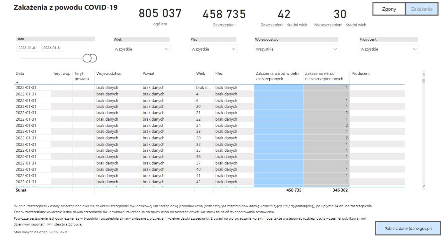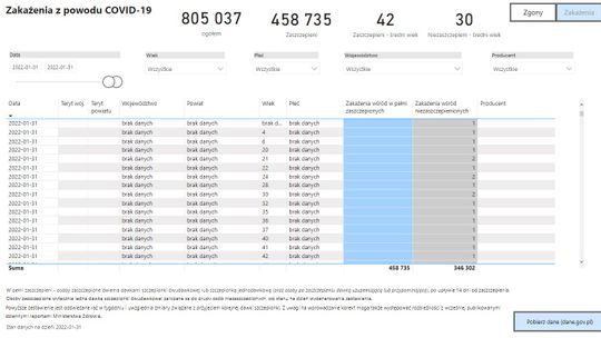 Od 1 do 31 stycznia tego roku z udostępnionych przez Ministerstwo Zdrowia danych wynika, że w całej Polsce osób, które zaraziły się koronawirusem było 805 037, wśród nich aż 458 735 to osoby zaczepione a 346 302 to niezaszczepieni.