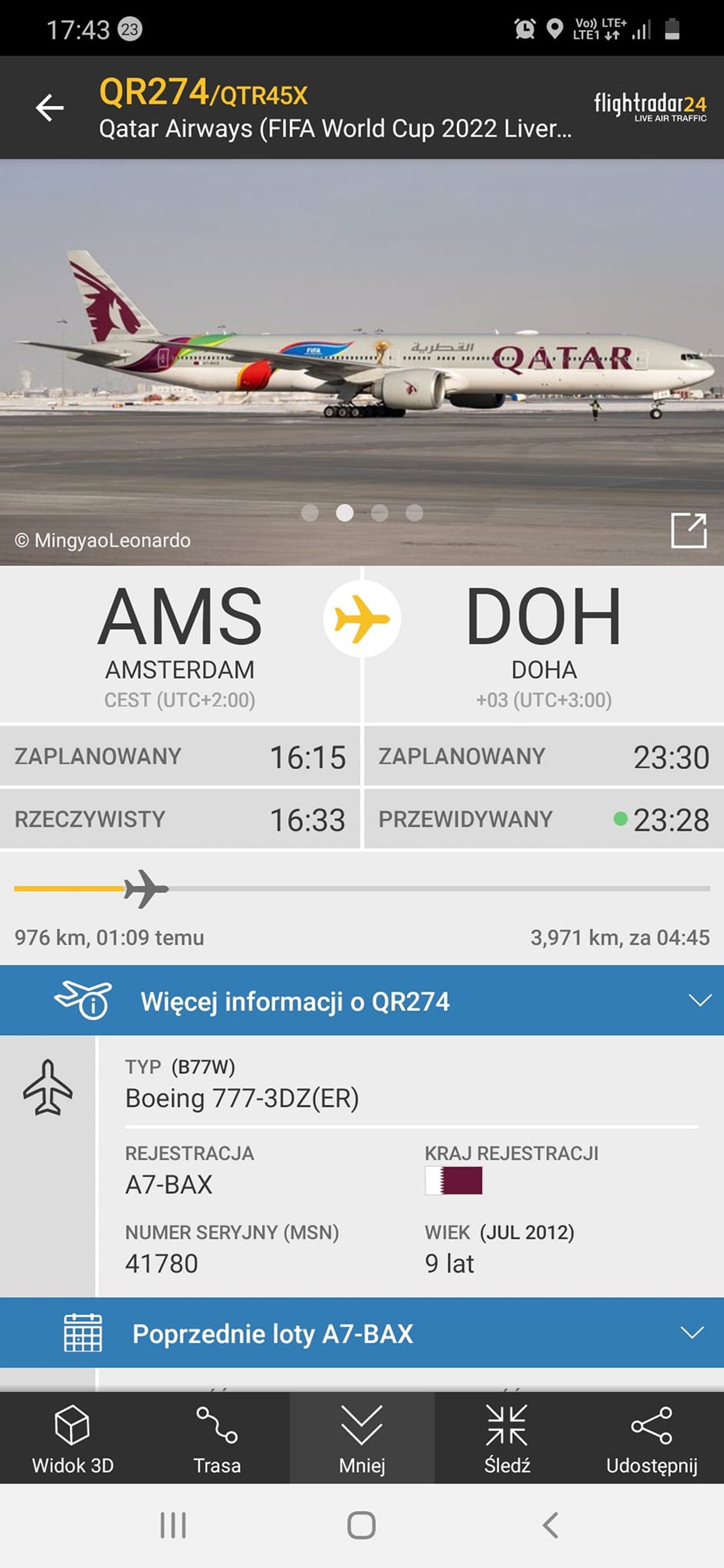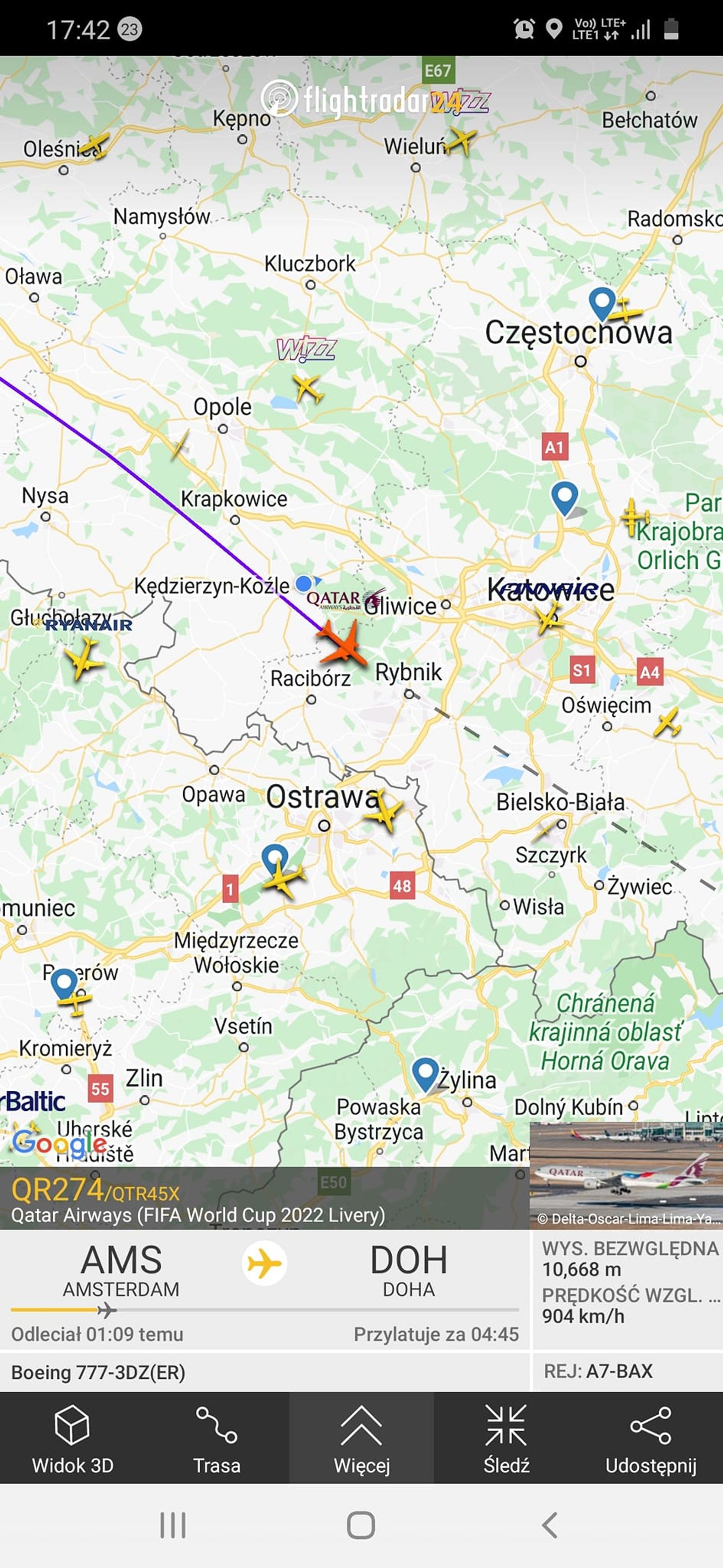 „Na wysokości prawie 11.000 m udało się ustrzelić Boeinga 777 w ciekawym malowaniu z mistrzostw świata w piłce nożnej w Katarze. Maszyna w barwach Qatar Airways leci z Amsterdamu do Doha” - napisał na swoim facebookowym profilu Krzysztof Deneka.