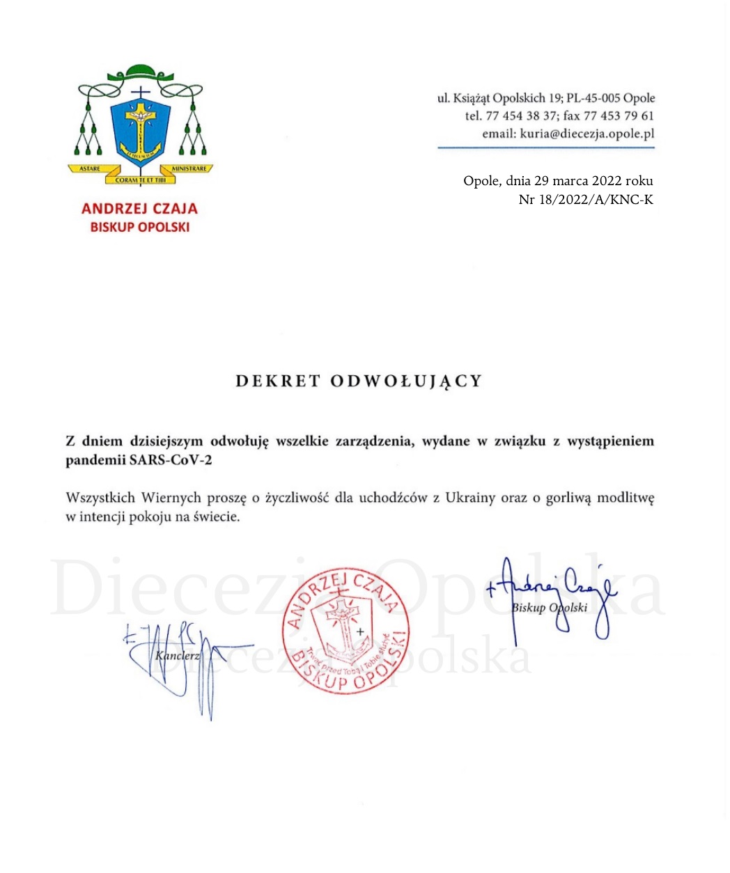 „W związku z zmianami w obostrzeniach epidemicznych na terenie naszego kraju i nowym Rozporządzeniem RP, 29 marca br. Biskup Opolski wydał dekret odwołujący wszelkie wcześniejsze zarządzenia wydane w związku z wystąpieniem pandemii SARS-CoV-2. Odwołanie dotychczasowych zarządzeń i ograniczeń nie wyklucza możliwości zachowania środków ostrożności adekwatnych do aktualnej sytuacji epidemicznej w parafii” – czytamy na stronie diecezji opolskiej.