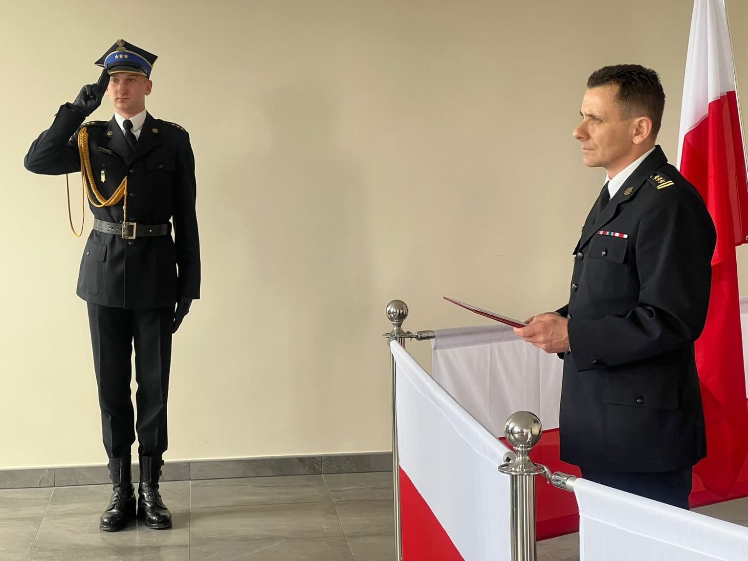 Słowem wstępu Komendant Powiatowy nawiązał do roty ślubowania, podkreślając znaczenie tej chwili w życiu zawodowym każdego strażaka. Zaznaczył także, że funkcjonariusz reprezentuje tą formację nie tylko w czasie służby ale także poza nią. Podejmując służbę w Państwowej Straży Pożarnej, strażak składa ślubowanie według następującej roty: