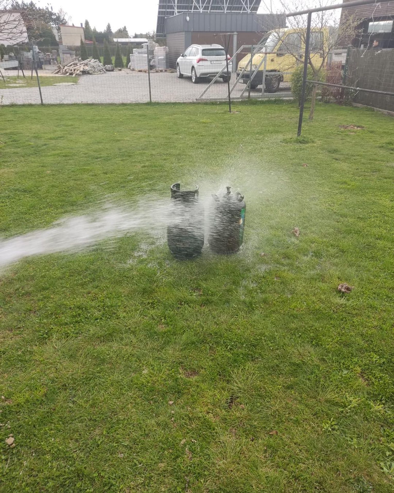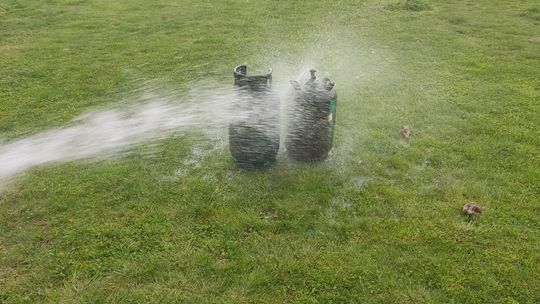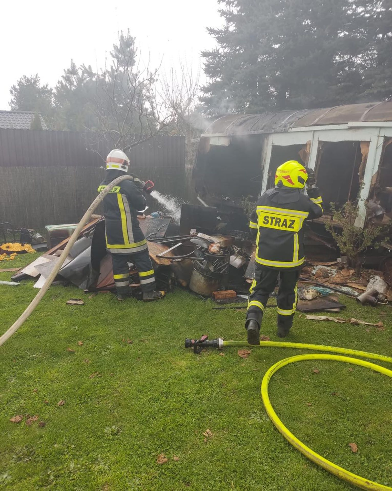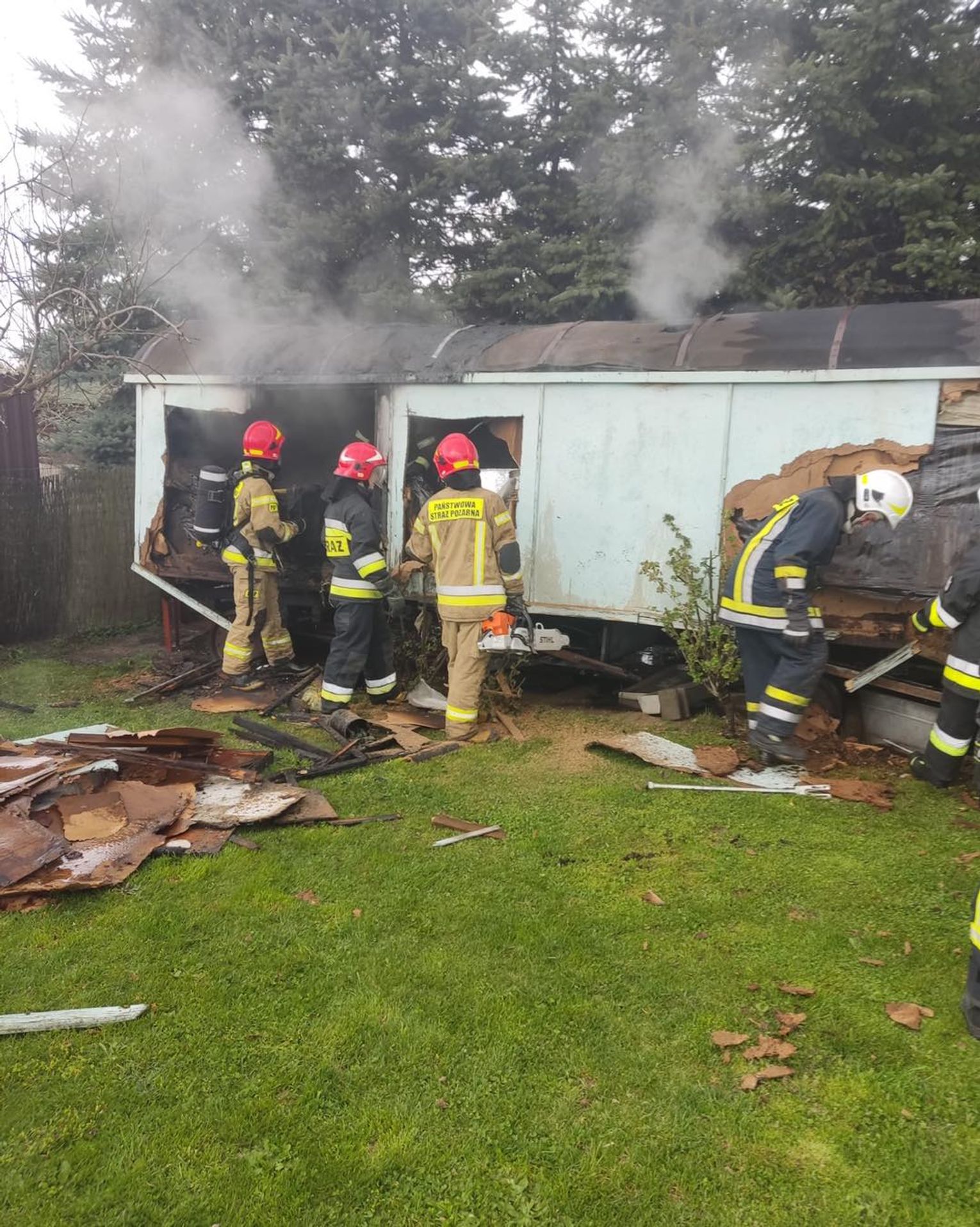 Do zdarzenia zadysponowano zastępy PSP z Jednostki Ratowniczo-Gaśniczej nr 1 oraz OSP Bierawa i Dziergowice. Na miejscu okazało się, że pożar zagraża drzewom rosnącym w bliskim sąsiedztwie. W przyczepie znajdowało się wyposażenie oraz 11-kg butle z propan-butanem. Strażacy szybko przystąpili do działań gaśniczych i wynieśli butle w bezpieczne miejsce. Po ich ostudzeniu dokonali pomiarów temperatury przy pomocy kamer termowizyjnych oraz sprawdzili obecność gazów wybuchowych detektorem. Aby dogasić pożar do końca, konieczne było rozebranie przyczepy. W trakcie prac rozbiórkowych wewnątrz spalonego obiektu ujawniono trzecią butlę na gaz propan-butan, którą również wyniesiono na zewnątrz i schłodzono ją. Na szczęście nikomu nic się nie stało.