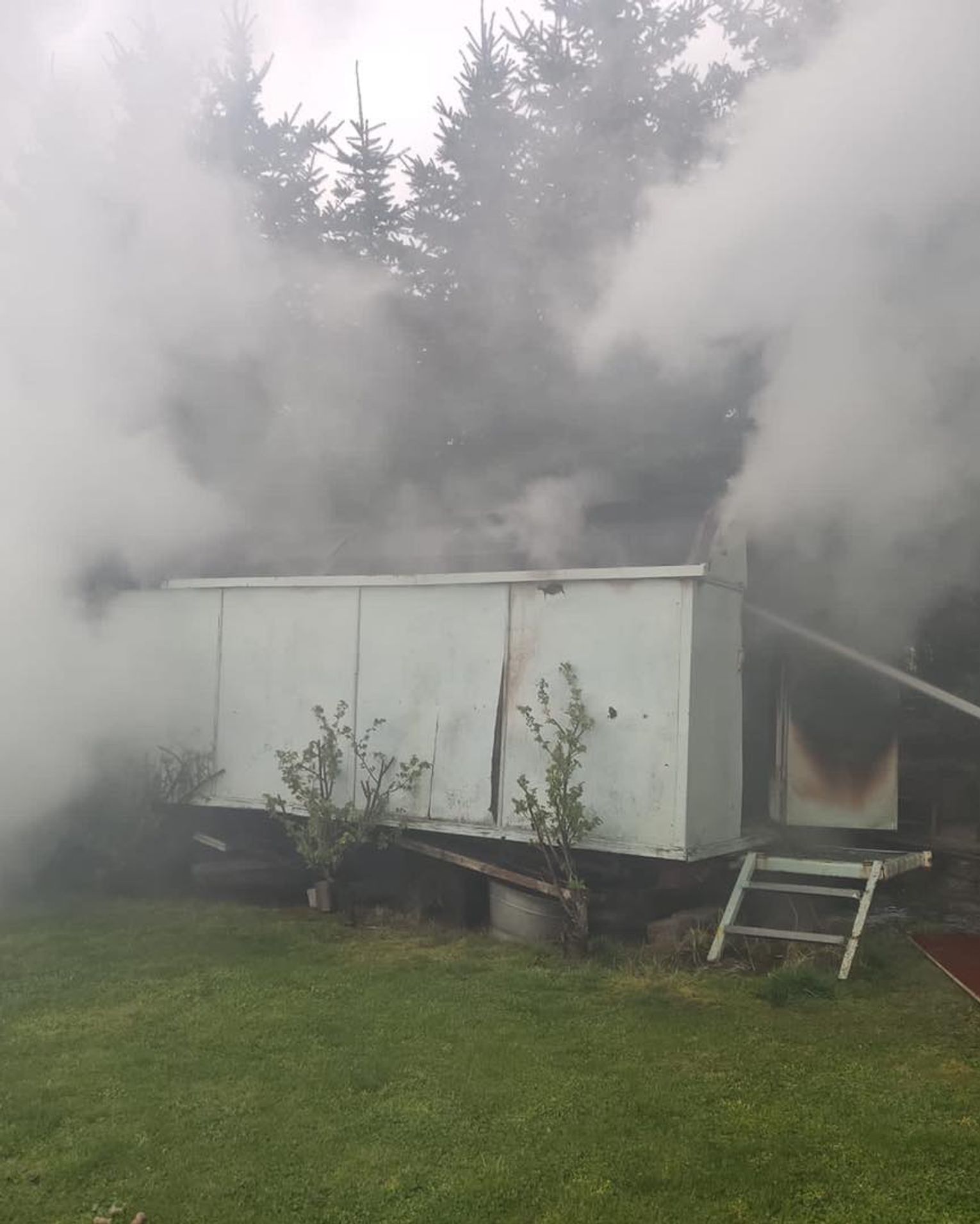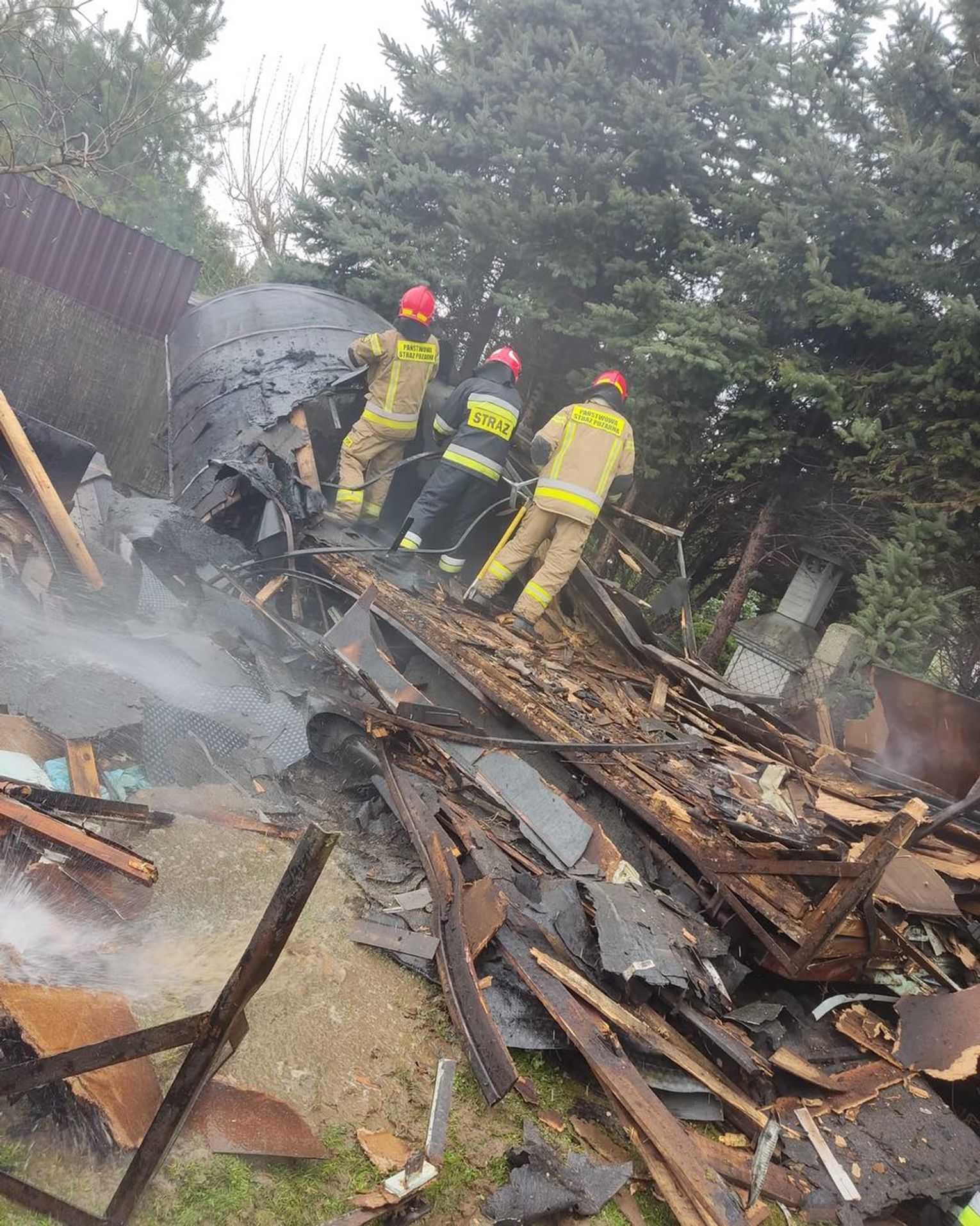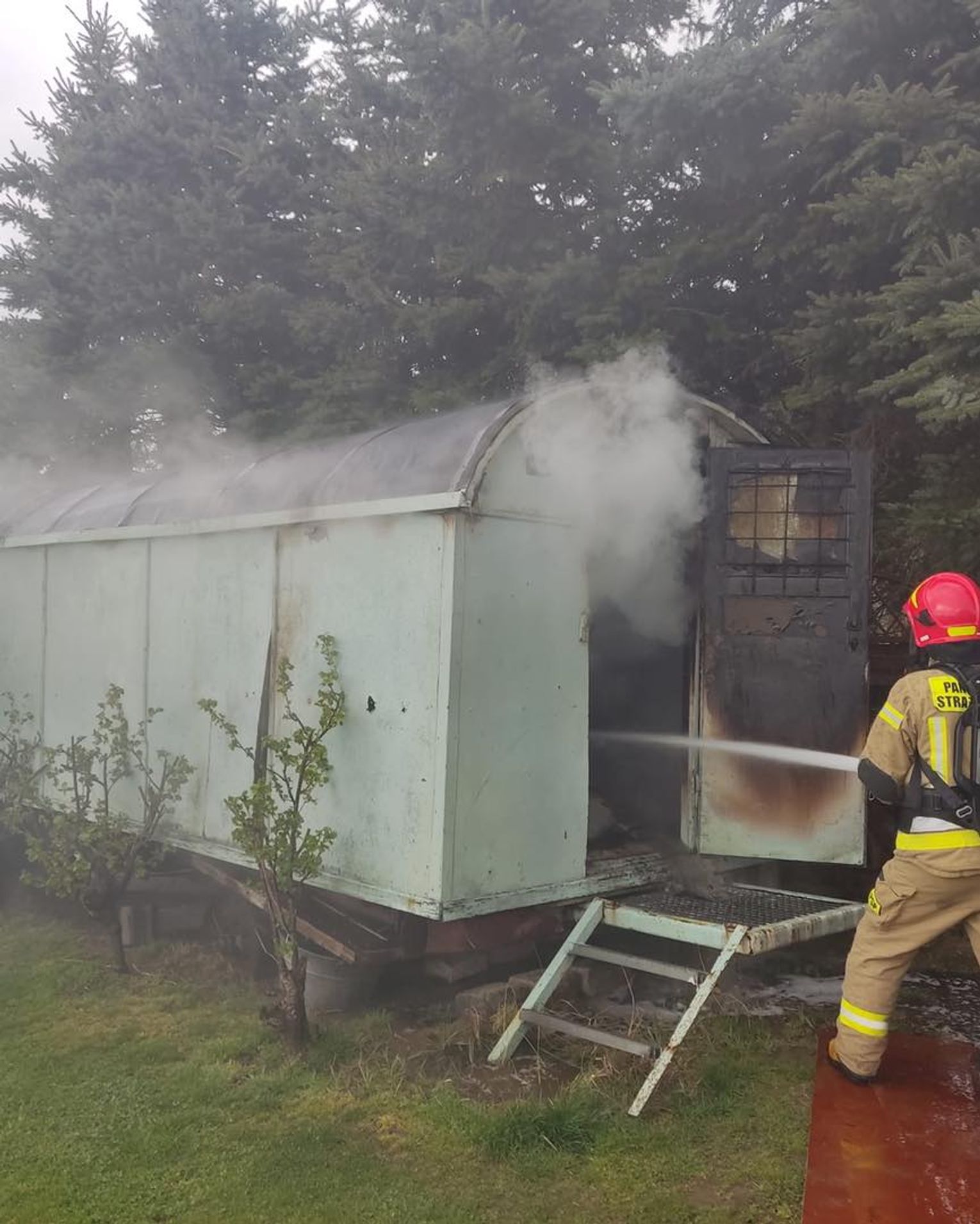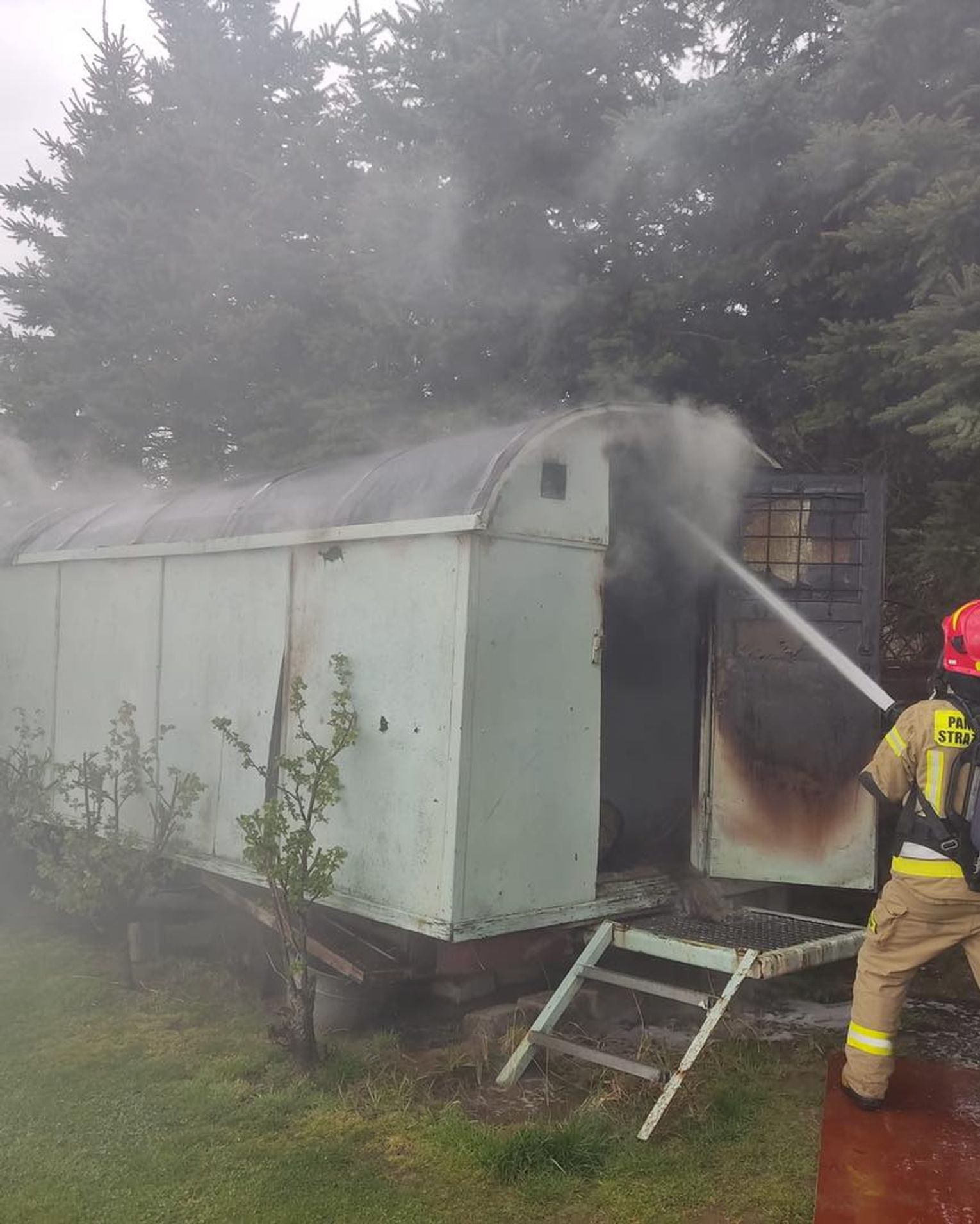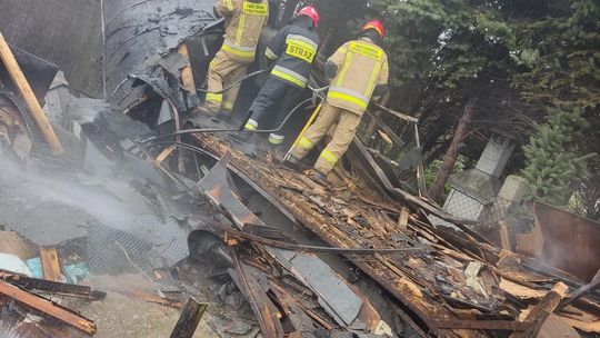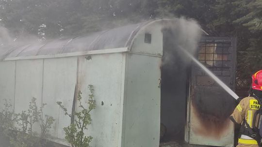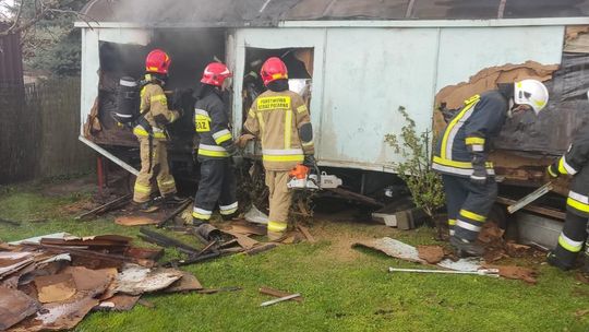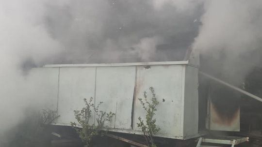 Pożar drewnianej przyczepy magazynowej. W środku butle z gazem