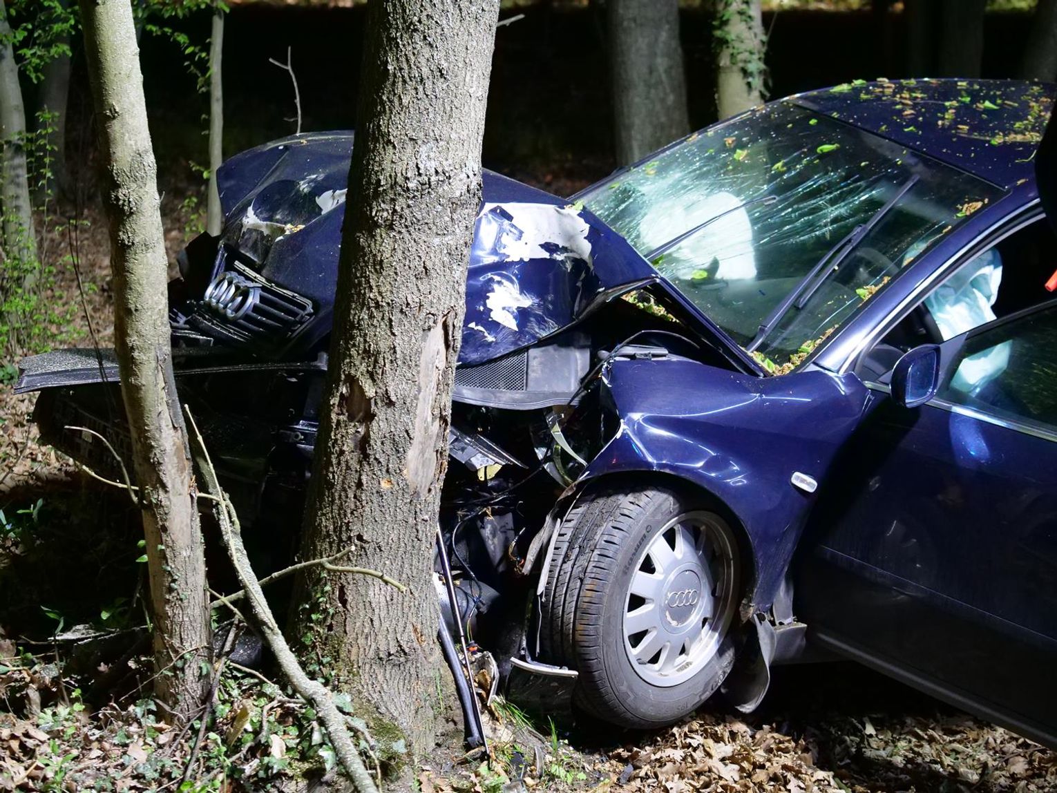 Osobowe audi uderzyło w drzewo. Kierowca uciekł do lasu