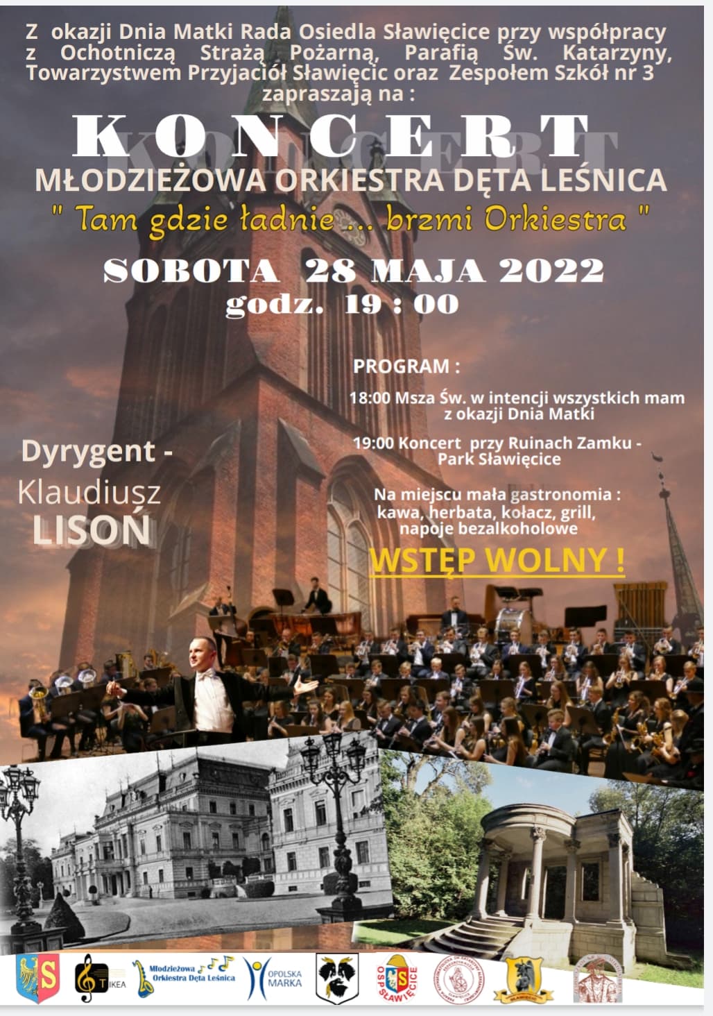 Impreza pod hasłem "Tam, gdzie ładnie... brzmi Orkiestra" odbędzie się w sobotę, 28 maja o godzinie 19 przy ruinach zamku w sławicickim parku. Na miejscu mała gastronomia: kawa, herbata, kołacz, grill oraz napoje bezalkoholowe. Wstęp na koncert jest darmowy. Wydarzenie poprzedzi Msza święta w intencji wszystkich mam o godzinie 18.00.