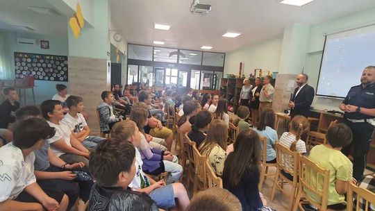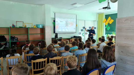 W trakcie spotkania z uczniami podkom. Tomasz Kukułka rozmawiał o obowiązujących przepisach i zasadach bezpiecznego poruszania się po drogach. Przedstawił jak bezpiecznie i zgodnie z przepisami korzystać z roweru, hulajnogi, hulajnogi elektrycznej oraz innych urządzeń transportu osobistego (UTO). Uczniowie bardzo aktywnie uczestniczyli w spotkaniu i wykazali się niemałą wiedzą. Każdy uczestnik zajęć otrzymał na zakończenie kamizelkę i opaskę odblaskową oraz światła rowerowe.
