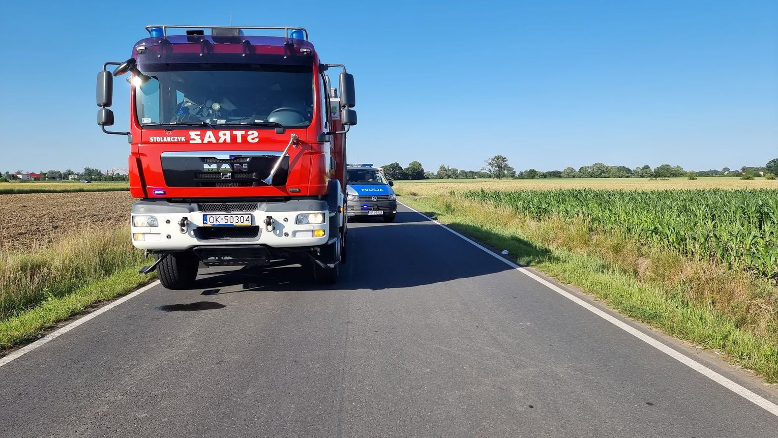 Cztery zastępy straży pożarnej, dwa zespoły ratownictwa medycznego oraz dwa patrole policji zostali zadysponowani do wypadku na drodze pomiędzy Roszowickim Lasem a Ciskiem.