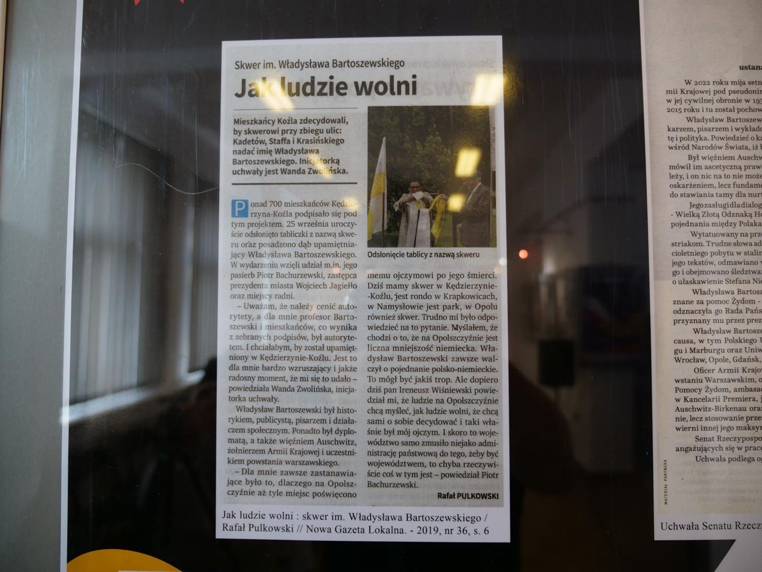 Wystawę przygotowała Miejska Biblioteka Publiczna w Kędzierzynie-Koźlu. Na ścianach można zobaczyć zdjęcia i wycinki prasowe poświęcone właśnie Władysławowi Bartoszewskiemu. W narożnych gablotach są też jego książki, które najprawdopodobniej znajdziemy także w zbiorach MBP.