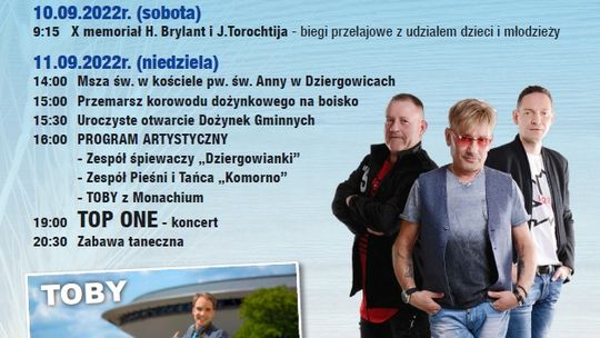 W niedzielę 11 września mszę zaplanowano na godzinę 14.00. Przemarsz korowodu dożynkowego na boisko w Dziergowicach wyruszy o godzinie 15.00.