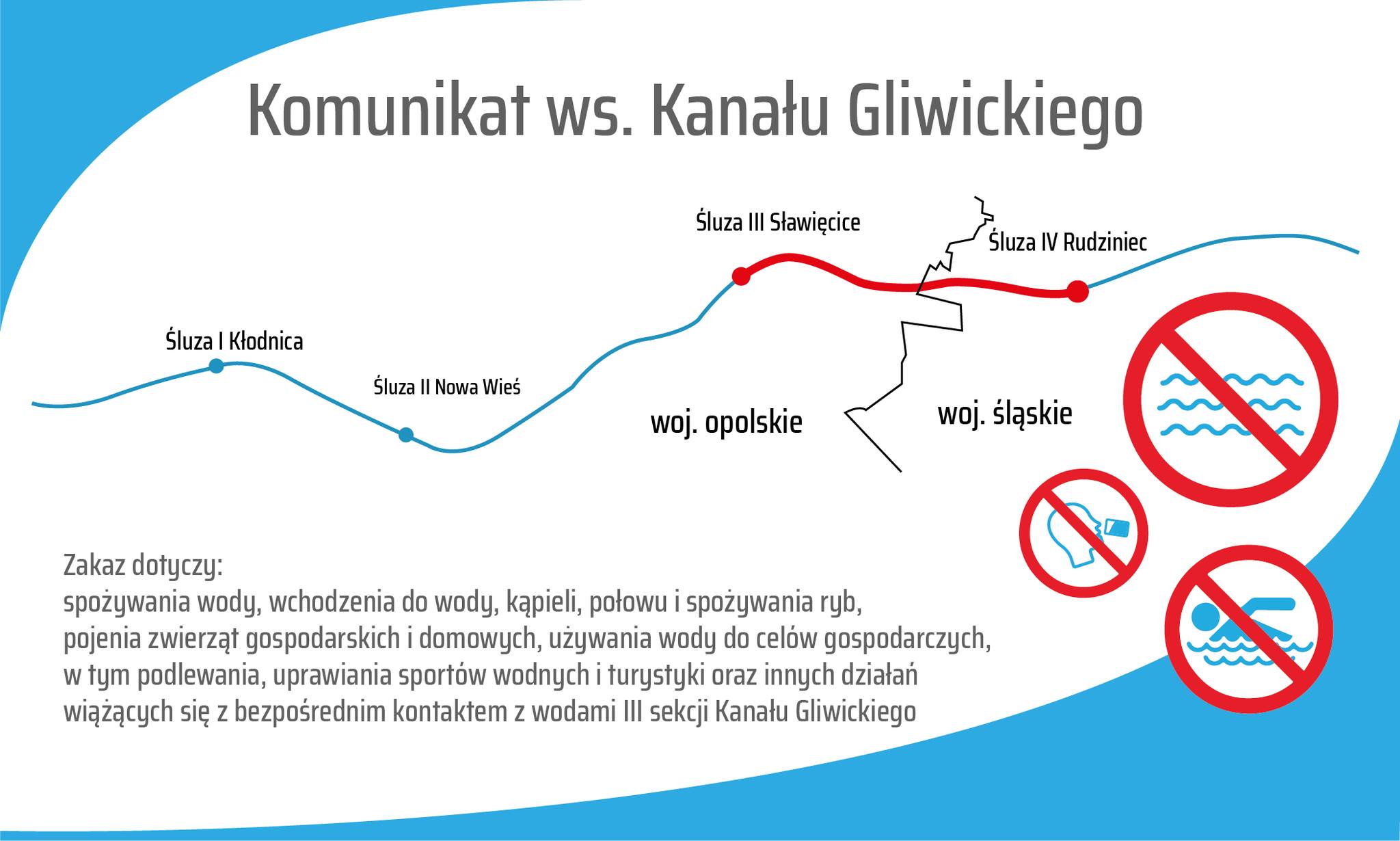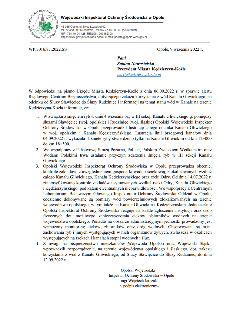 W dniu 6 września Rządowe Centrum Bezpieczeństwa wysłało do mieszkańców regionu alerty informujące o zakazie korzystania z wód Kanału Gliwickiego na odcinku od śluzy Rudziniec do śluzy Sławięcice. SMS nadany przez RCB nie określał czy korzystanie z wód Kanału Gliwickiego, Kłodnicy i Odry w pozostałych częściach miasta stanowi jakiekolwiek zagrożenie. Magistrat o doprecyzowanie tej kwestii zwrócił się do właściwej instytucji (czytaj więcej). Poniżej publikujemy otrzymaną odpowiedź: