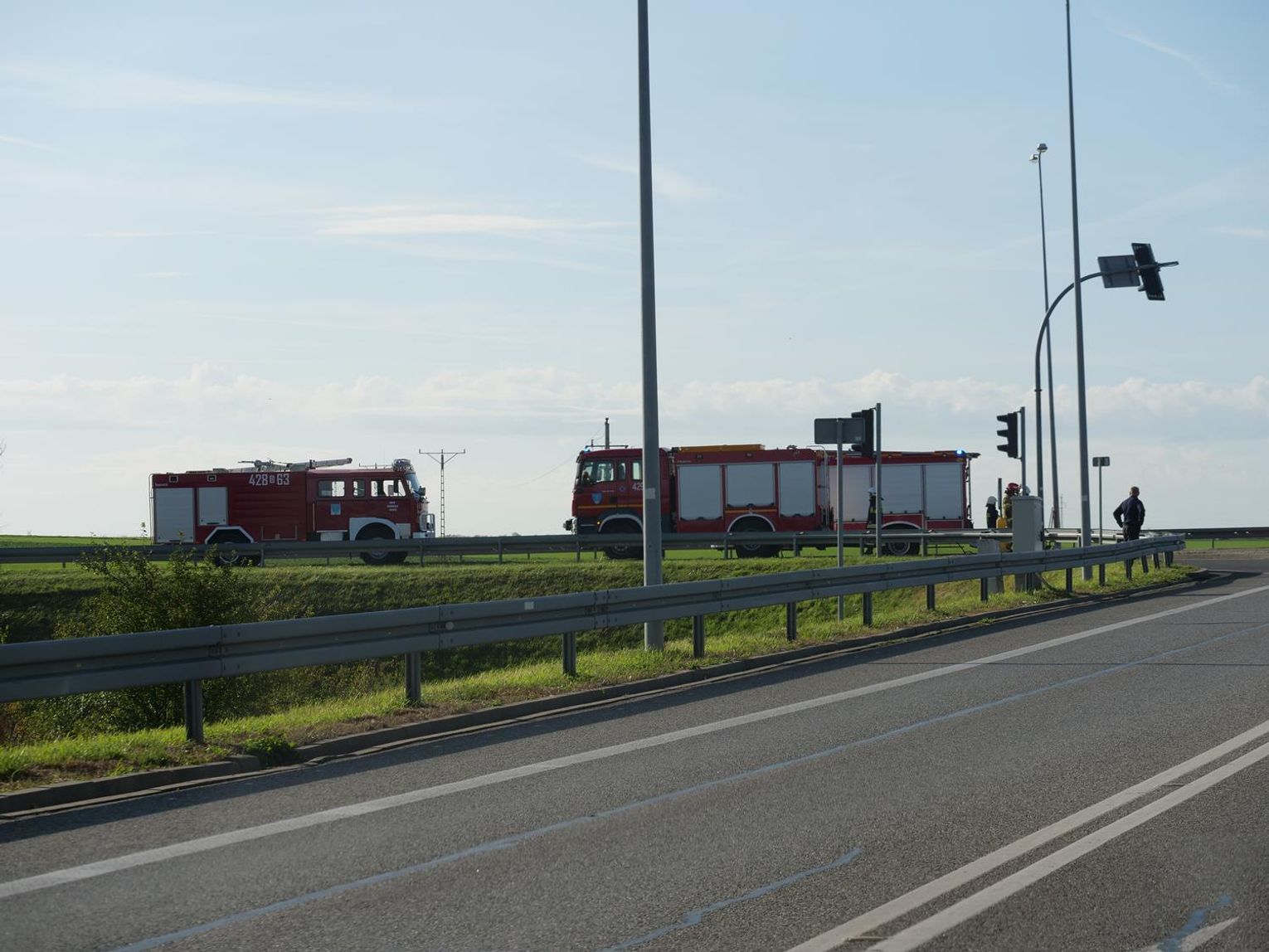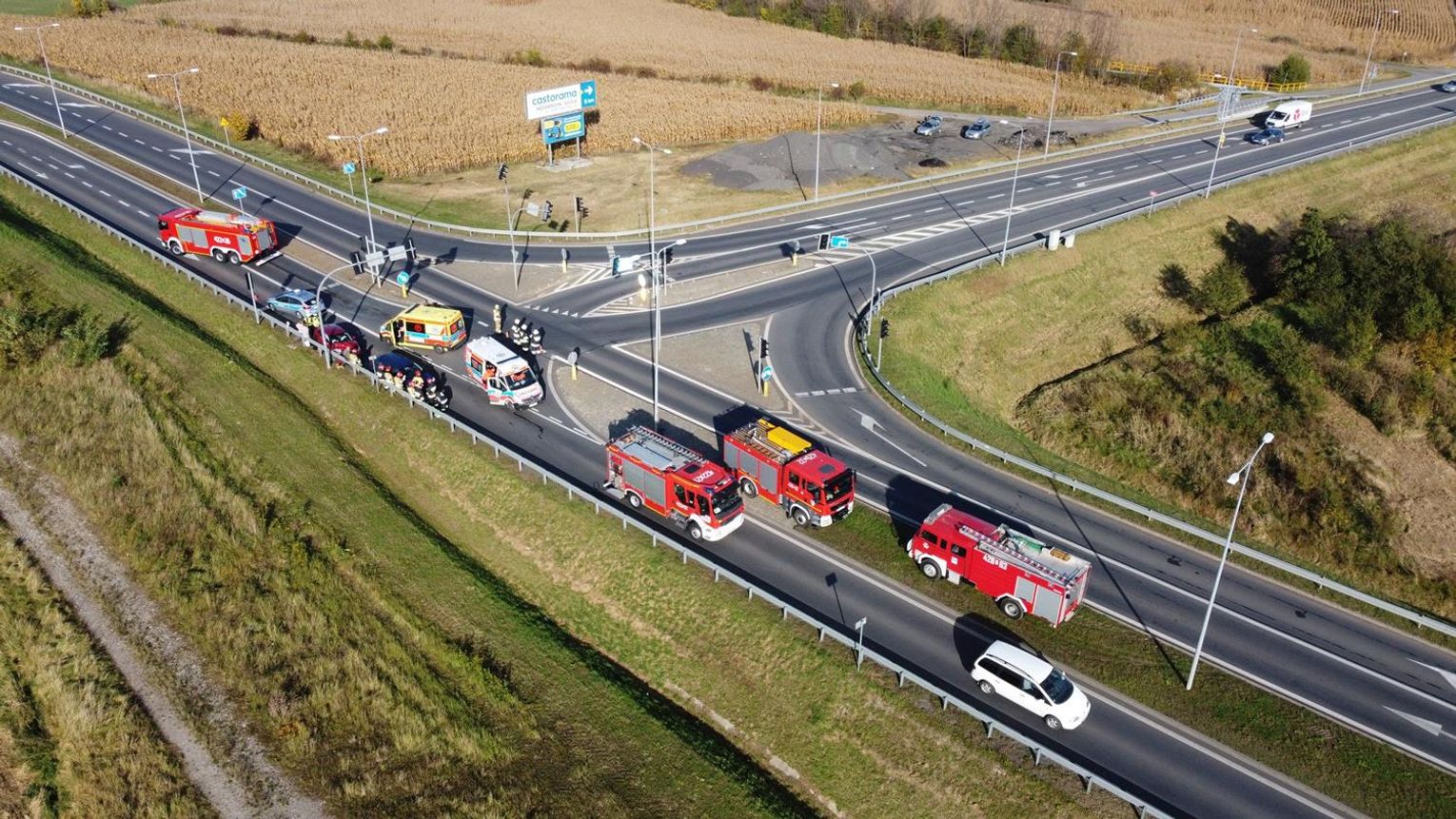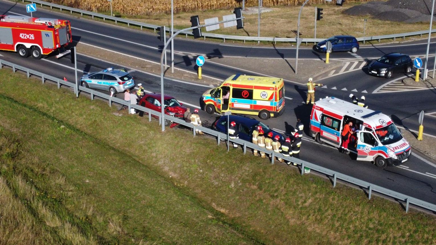 Na miejscu interweniowało pięć zastępów straży pożarnej, dwa zespoły ratownictwa medycznego oraz policjanci z wydziału ruchu drogowego, którzy ustalają szczegółowe okoliczności tego zdarzenia. Na czas prowadzonych działań ruch w tym miejscu odbywał się wahadłowo.