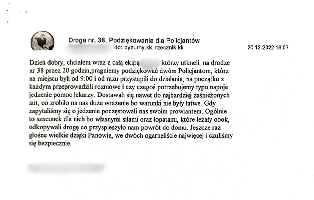 Dwóch funkcjonariuszy wykazało się ogromnym zaangażowaniem podczas tych działań. Świadczy o tym podziękowanie przesłane drogą mailową do kędzierzyńsko-kozielskiej Policji. Autorem jest jeden z kierowców, który utknął na DK38 i był tam uwięziony przez 20 godzin. Z pomocą przyszli dzielnicowi i właśnie za ich zaangażowanie oraz pomoc chciał podziękować kierowca.