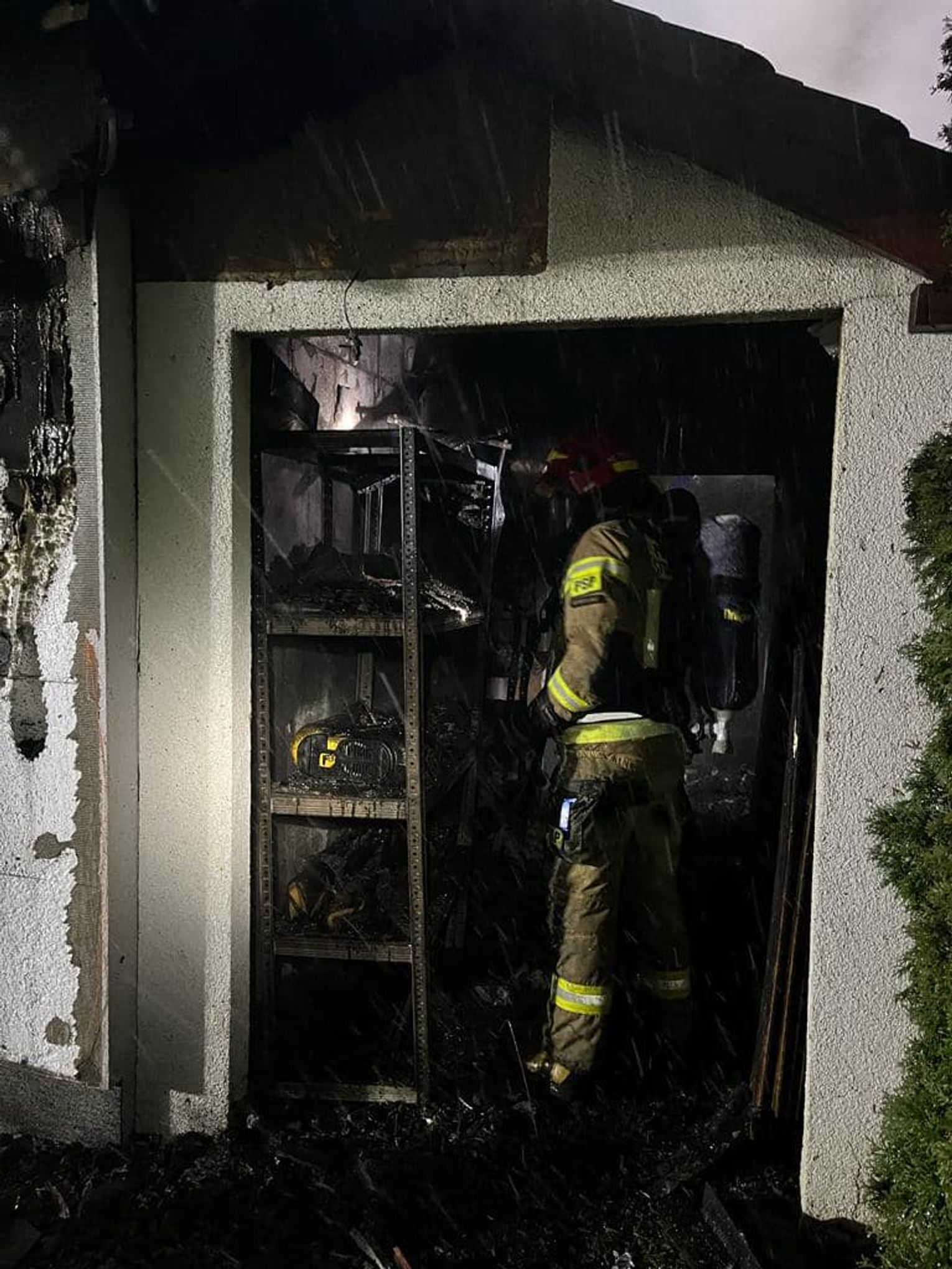 Na miejsce zadysponowano dwa zastępy z JRG nr 1 w Kędzierzynie-Koźlu oraz OSP Stara Kuźnia i OSP Kotlarnia. Po dojeździe na miejsce zdarzenia i przeprowadzeniu rozpoznania kierujący działaniami ratowniczymi potwierdził rozwinięty pożar wolnostojącego budynku garażowego. Działania polegały na podaniu prądów wody na palący się dach oraz wyposażenie i późniejszej rozbiórki zniszczonych elementów konstrukcyjnych. Całkowitemu spaleniu uległo wyposażenie oraz drewniana konstrukcja zadaszenia budynku. Podjęcie szybkich działań gaśniczych pozwoliło obronić dom mieszkalny przed działaniem ognia, który znajdował się zaledwie kilka metrów od płonącego garażu. Na szczęście w zdarzeniu nie było osób poszkodowanych.