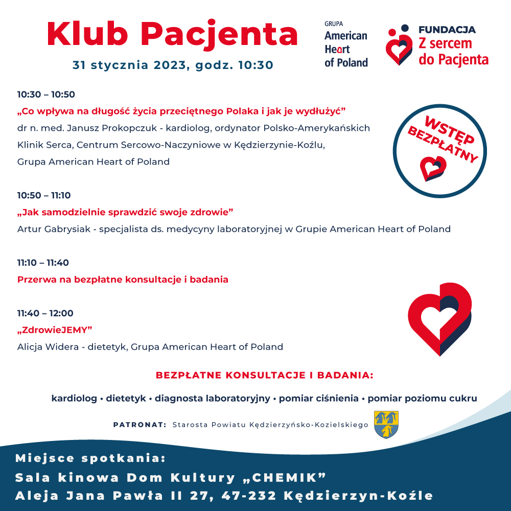 Na początek o godz. 10.30 dr Janusz Prokopczuk, ordynator Polsko-Amerykańskich Klinik Serca, Centrum Sercowo-Naczyniowego w Kędzierzynie-Koźlu, który opowie o tym, co wpływa na przeciętną długość życia i jak je wydłużyć. Będzie też wiele innych wartościowych informacji!