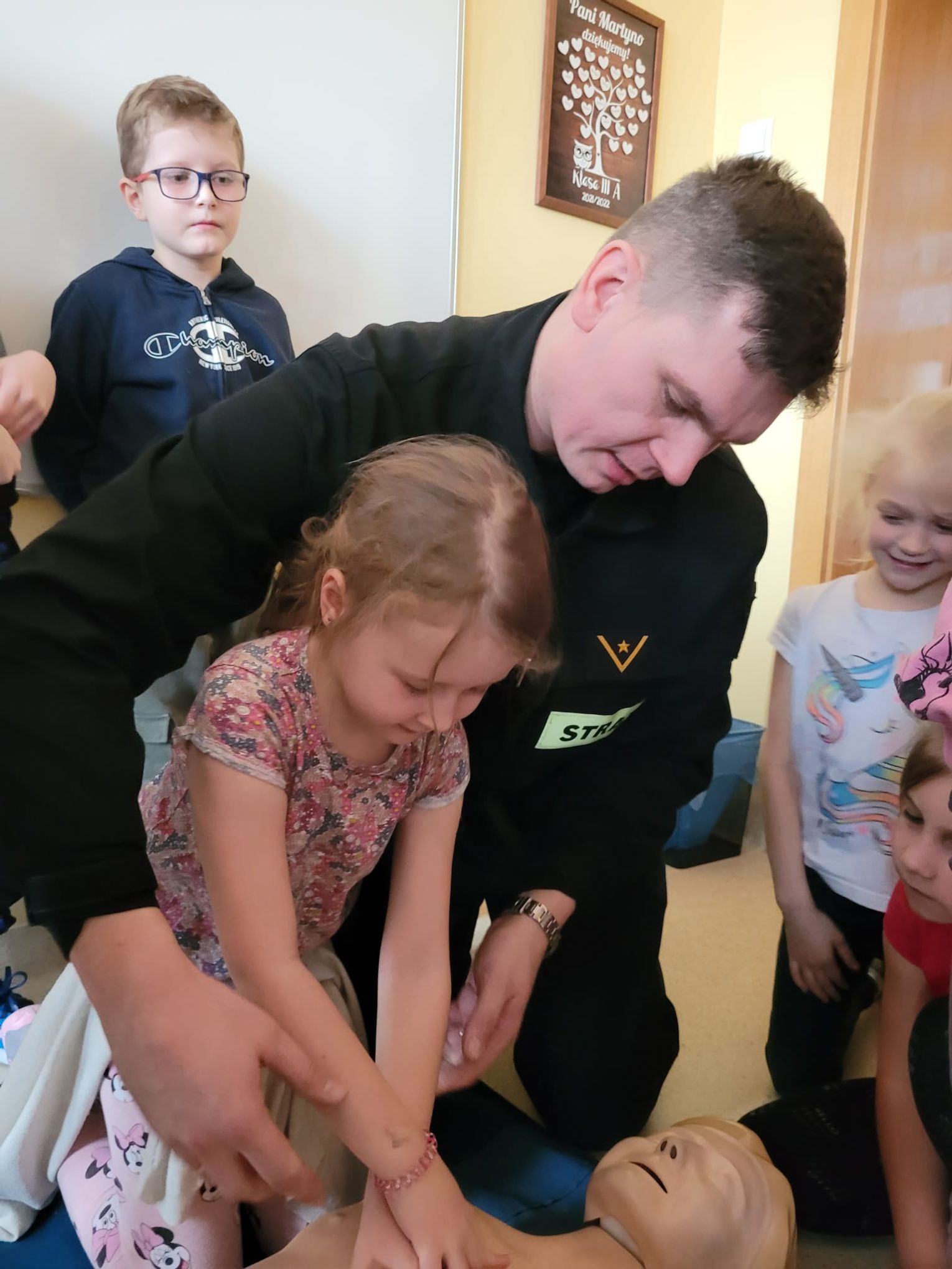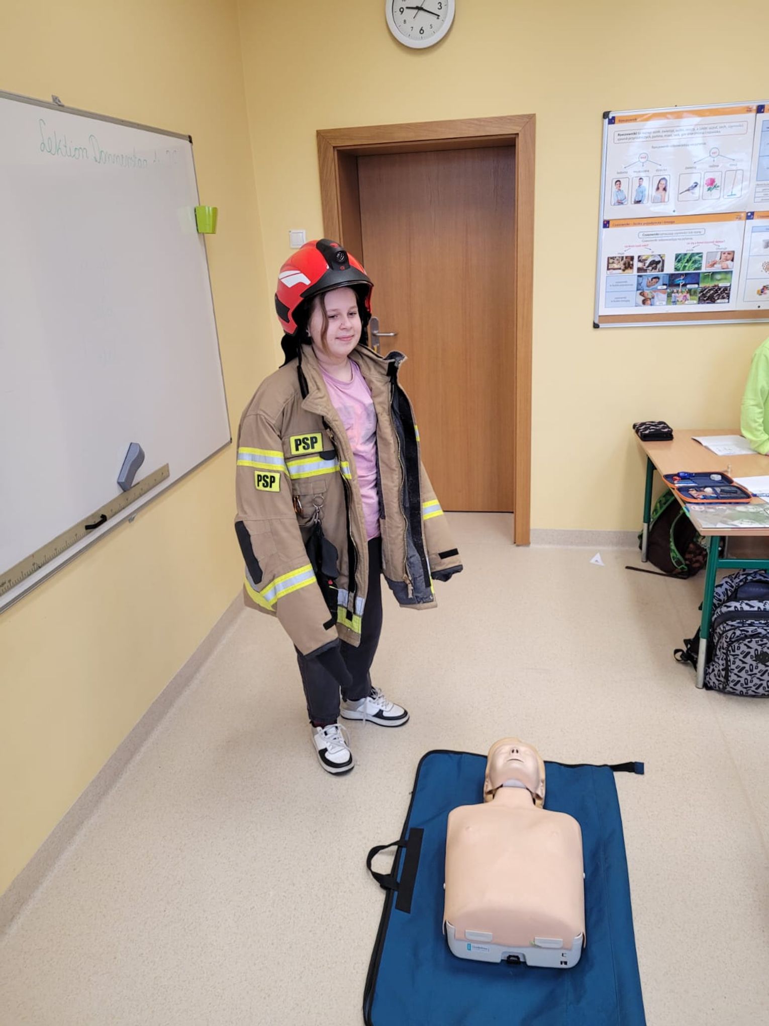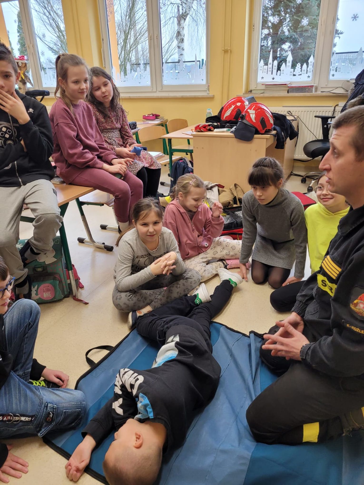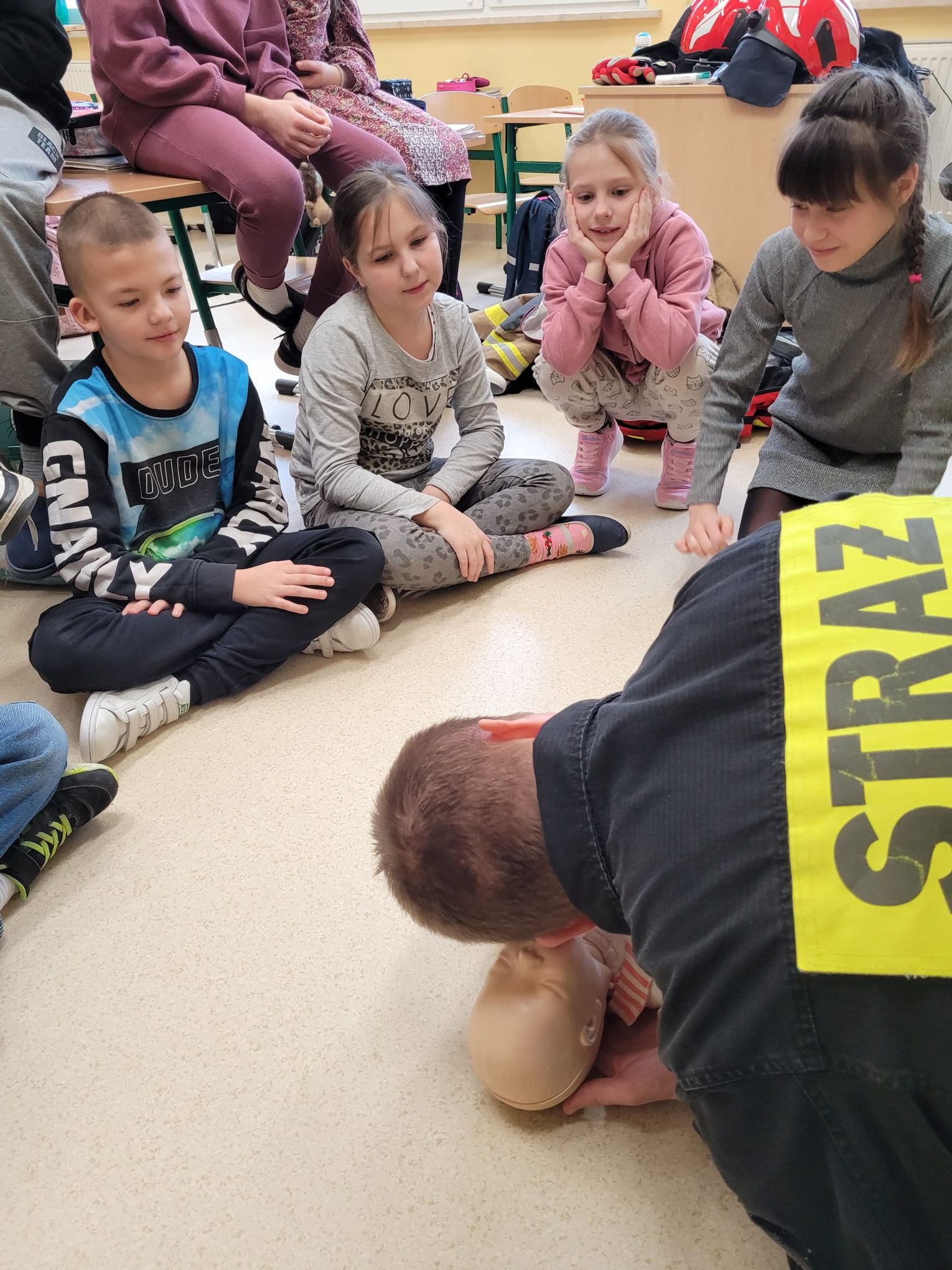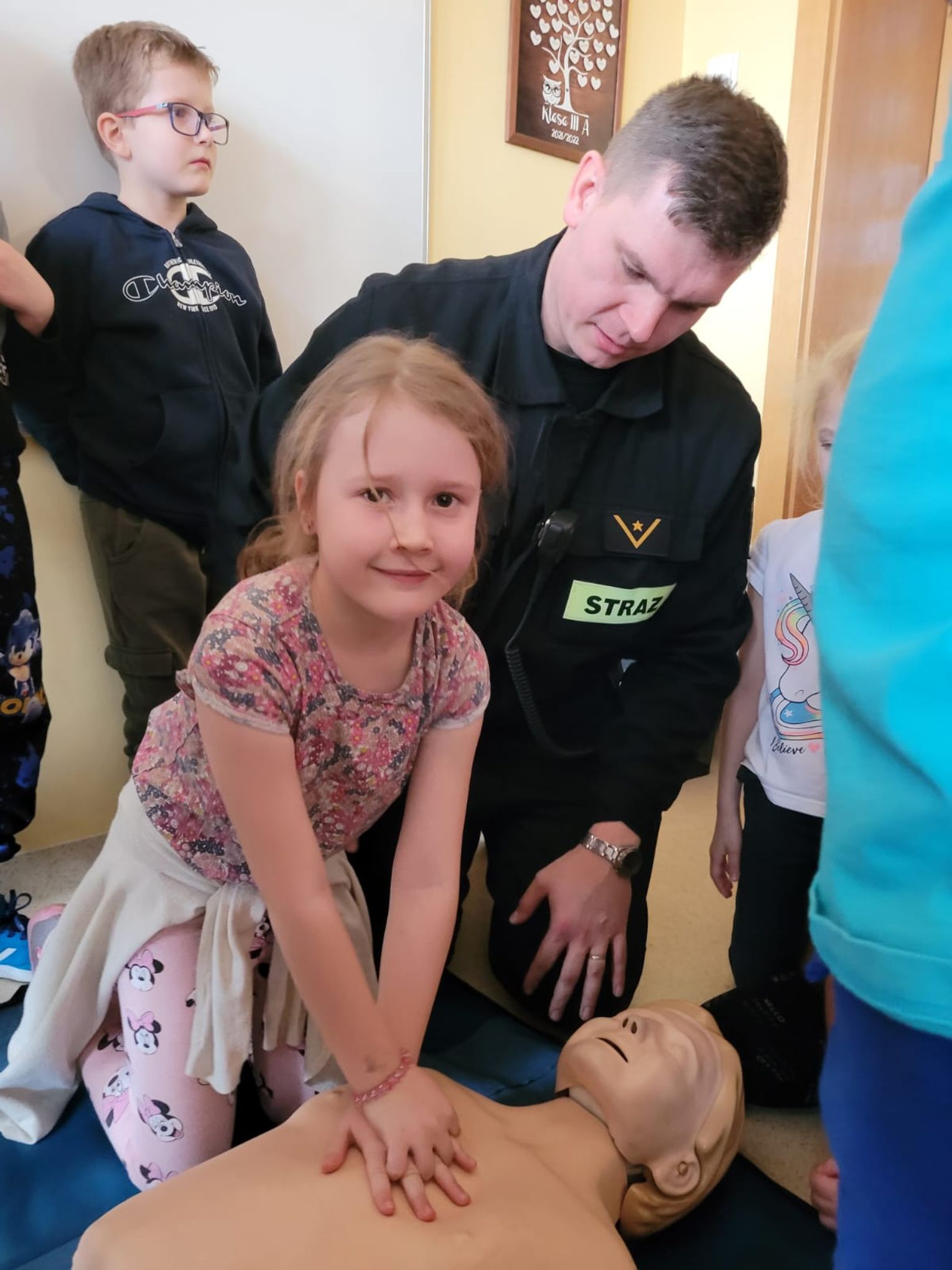W czasie spotkania strażacy Michał i Adrian z Jednostki Ratowniczo-Gaśniczej nr 2 zaprezentowali jak prawidłowo udzielać pierwszej pomocy. Odpowiedzieli na mnóstwo pytań, które nurtowały dzieci: m.in. o pracy strażaków i ich wyposażeniu. Dzieci miały możliwość również przećwiczenia Resuscytacji Krążeniowo-Oddechowej (RKO) na fantomie.