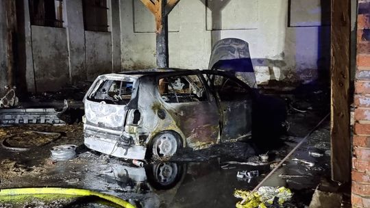 Pojazd miał wgnieciony dach i odkręcone tablice rejestracyjne. Samochód spłonął doszczętnie. Obok budynku znajdowały się świeże ślady opon.