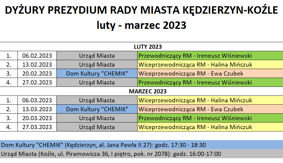 Spotkania z przewodniczącym Ireneuszem Wiśniewskim oraz jego zastępczyniami Haliną Mińczuk i Ewą Czubek zaplanowano w urzędzie miasta przy ul. Piramowicza oraz w Domu Kultury „Chemik” przy al. Jana Pawła II.