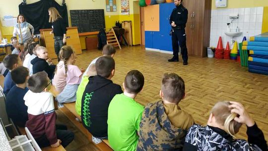 Dzielnicowy mł. asp. Jakub Lipiński i sierż. Rafał Gajda odwiedzili w ubiegłym tygodniu między innymi dzieci ze szkoły podstawowej w Dziergowicach oraz przedszkolaki z Bierawy.