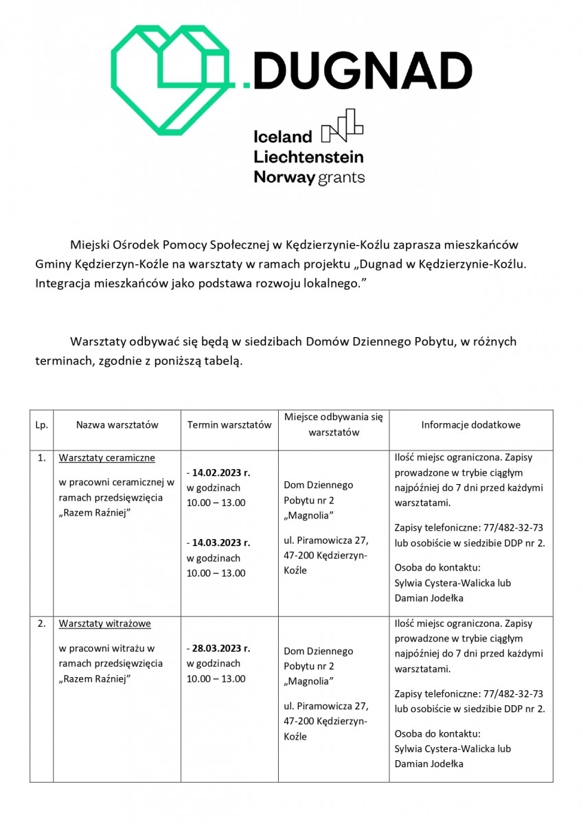 Zadanie realizowane jest w ramach projektu „Dugnad w Kędzierzynie-Koźlu. Integracja mieszkańców oraz odbudowa relacji sąsiedzkich jako podstawa rozwoju lokalnego”. Projekt jest współfinansowany w 85% ze środków Mechanizmu Finansowego Europejskiego Obszaru Gospodarczego 2014-2021 oraz w 15% z budżetu państwa.