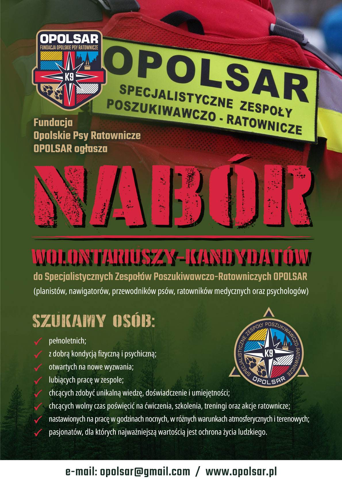 Poszukiwane są osoby pełnoletnie, z dobrą kondycją fizyczną i psychiczną, lubiące pracę w zespole, chcące zdobywać unikalną wiedzę oraz doświadczenia i umiejętności. Więcej szczegółów na plakacie oraz na stronie www.opolsar.pl