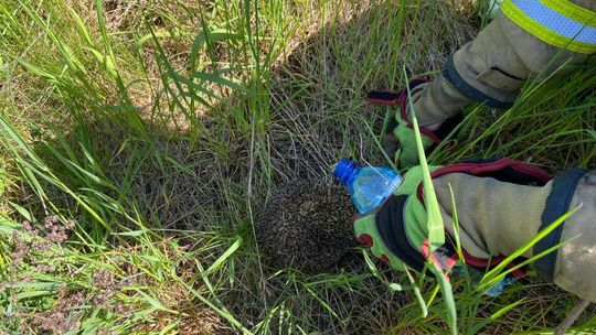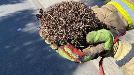 Strażacy niosą pomoc każdemu. Tym razem uratowali jeża, który wpadł do kanału technicznego nieopodal stacji paliw przy ulicy Kozielskiej.