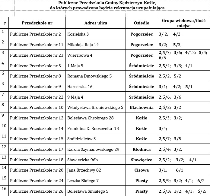 Rekrutacja prowadzona jest elektronicznie. Wnioski, druki oświadczeń, kryteria ustawowe i gminne obowiązujące przy przyjęciu dziecka do przedszkola dostępne są na stronie: www.kedzierzynkozle.przedszkola.vnabor.pl.