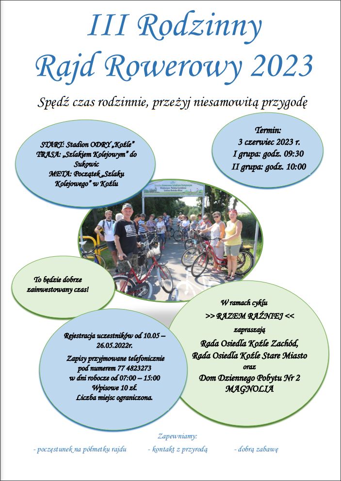 Trasa rajdu wiedzie z Koźla do Sukowic. Pierwsza grupa startuje o godz.9.30, a druga o godz. 10.00 w miejscu, gdzie rozpoczyna się Ścieżka Rowerowa Szlakiem Kolejowym (na pograniczu Kędzierzyna-Koźla i gminy Reńska Wieś (tuż za stadionem „Odry” w Koźlu, obok winiarni „Synapsa”).