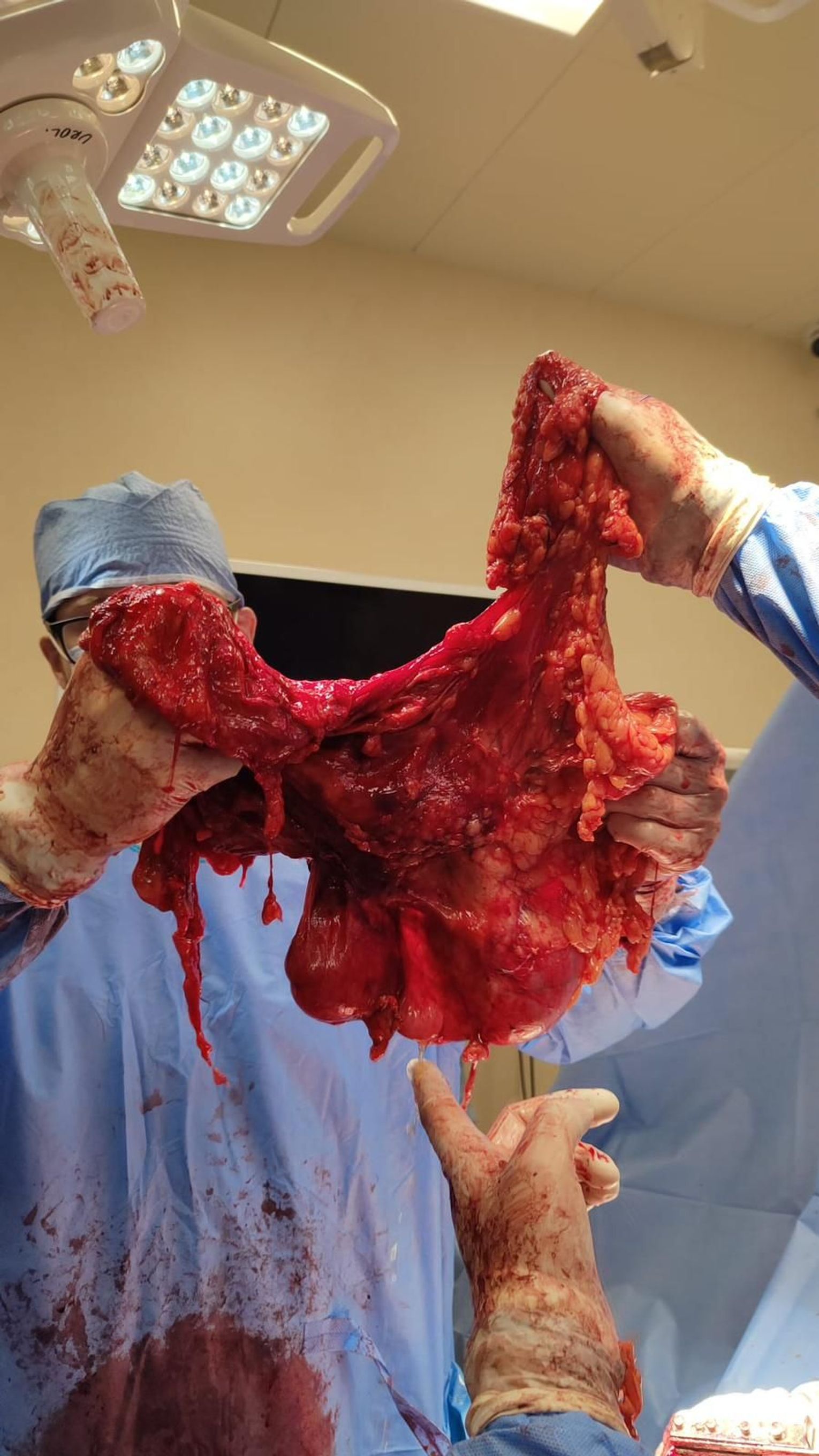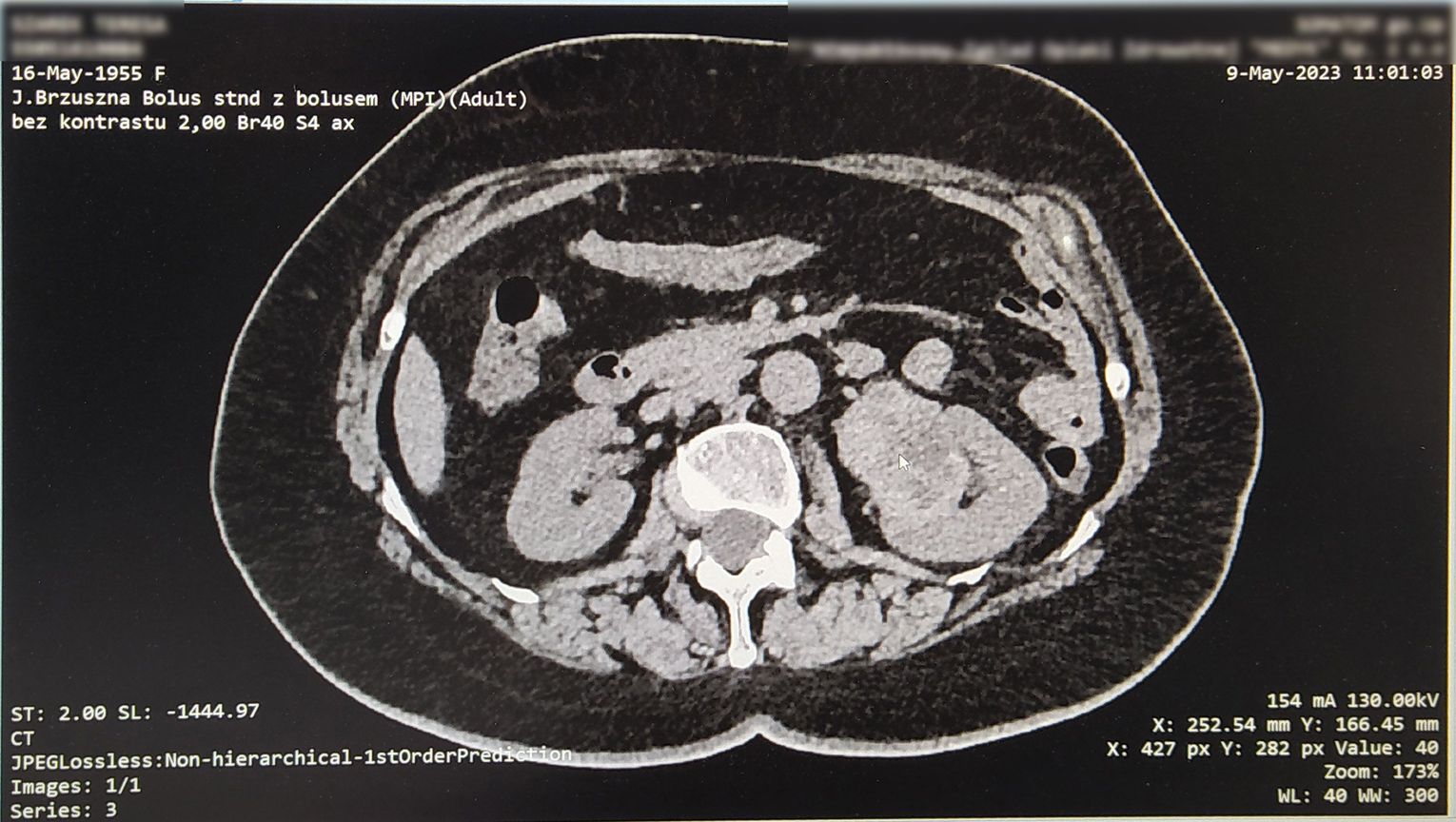 Drugi przypadek dotyczy pacjentki, która miała guza umiejscowionego w bardzo trudno operowalnym miejscu. Guz był wciśnięty pomiędzy żyłę i tętnicę nerkową, dwie najważniejsze arterie odżywcze dla nerki, przy samej jej strukturze. Istniała konieczność preparowania milimetr po milimetrze, na małej przestrzeni, z zachowaniem bardzo dużej ostrożności, z uwagi na bliskość głównych naczyń krwionośnych. Guz w całości usunięto pozostawiając nerkę w nienaruszonym stanie. Zabieg wykonano w technice klasycznej otwartej, z uwagi na wielkość guza. Pacjentka czuje się dobrze.