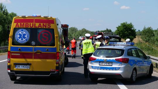 Na miejsce zadysponowano trzy zespoły ratownictwa medycznego, dwa zastępy straży pożarnej oraz kilka patroli policji. Droga została całkowicie zablokowana od ronda Milenijnego do ronda w Reńskiej Wsi. Jak udało się ustalić, mężczyzna podróżujący Volkswagenem Passatem na kędzierzyńsko-kozielskich tablicach rejestracyjnych jadąc w kierunku Śródmieścia zjechał na przeciwległy pas ruchu i zderzył się z prawidłowo jadącym Volkswagenem Golfem na strzeleckich tablicach rejestracyjnych. Siła uderzenia była tak duża, że samochody obróciło o 180 stopni i zatrzymały się w odległości blisko 100 metrów od siebie, po czym w Passata uderzył jeszcze jadący od strony ronda Milenijnego Opel na krakowskich tablicach rejestracyjnych. Ranny został jedynie kierowca Passata, który został został zakleszczony w pojeździe. Kiedy strażacy wycięli drzwi, przekazali poszkodowanego zespołowi ratownictwa medycznego, a ci przetransportowali go do szpitala. Pozostali uczestnicy nie wymagali pomocy medycznej. Kierowca Passata nie pamięta, jak doszło do tego zdarzenia. Policjanci pracujący na miejscu ustalają szczegółowe okoliczności tego zdarzenia. Ruch został przywrócony dopiero około godziny 13.30.