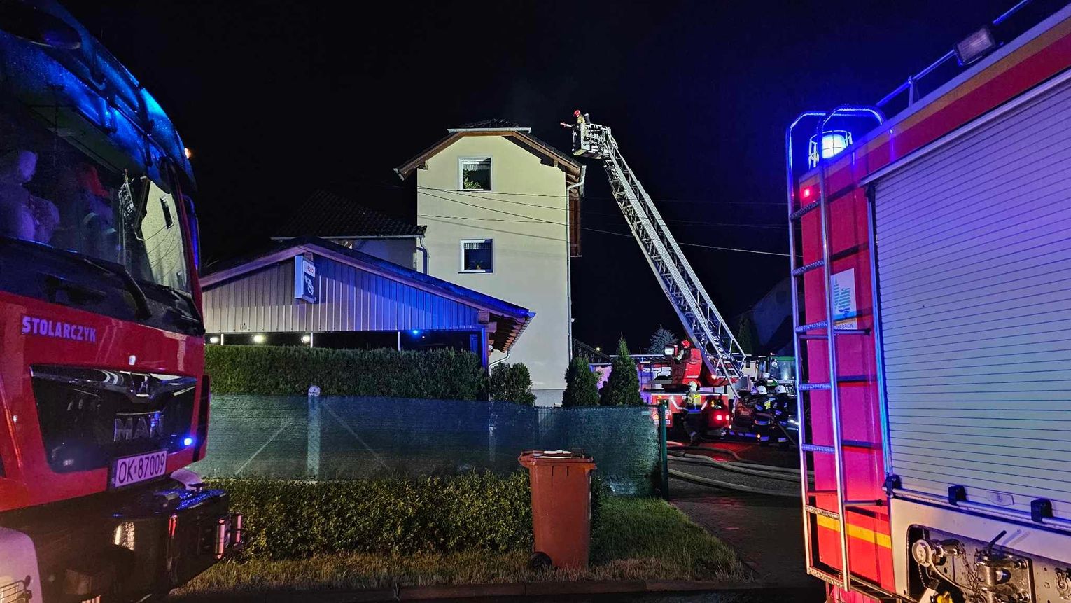 Piorun uderzył w dach dwupiętrowego domu. Lokatorzy (kobieta i dwóch mężczyzn) ewakuowali się przed przybyciem straży pożarnej. Jeden z mężczyzn próbował gasić pożar we własnym zakresie gaśnicą proszkową, a później śniegową. Zgłoszenie do dyżurnego Komendy Powiatowej Państwowej Straży Pożarnej w Kędzierzynie-Koźlu wpłynęło we wtorek, 27 czerwca około godziny 0.40. Zapaliła się konstrukcja dachu. Zagrożenie zostało szybko opanowane. Na szczęście nikomu nic się nie stało. Po ugaszeniu pożaru, działania strażaków polegały na usunięciu spalonych elementów poddasza i sprawdzeniu kamerą termowizyjną całego dachu oraz oddymianiu pomieszczeń. A na koniec zabezpieczyli dach folią przed zalaniem przez deszcz. Działania zakończono po dwóch godzinach.