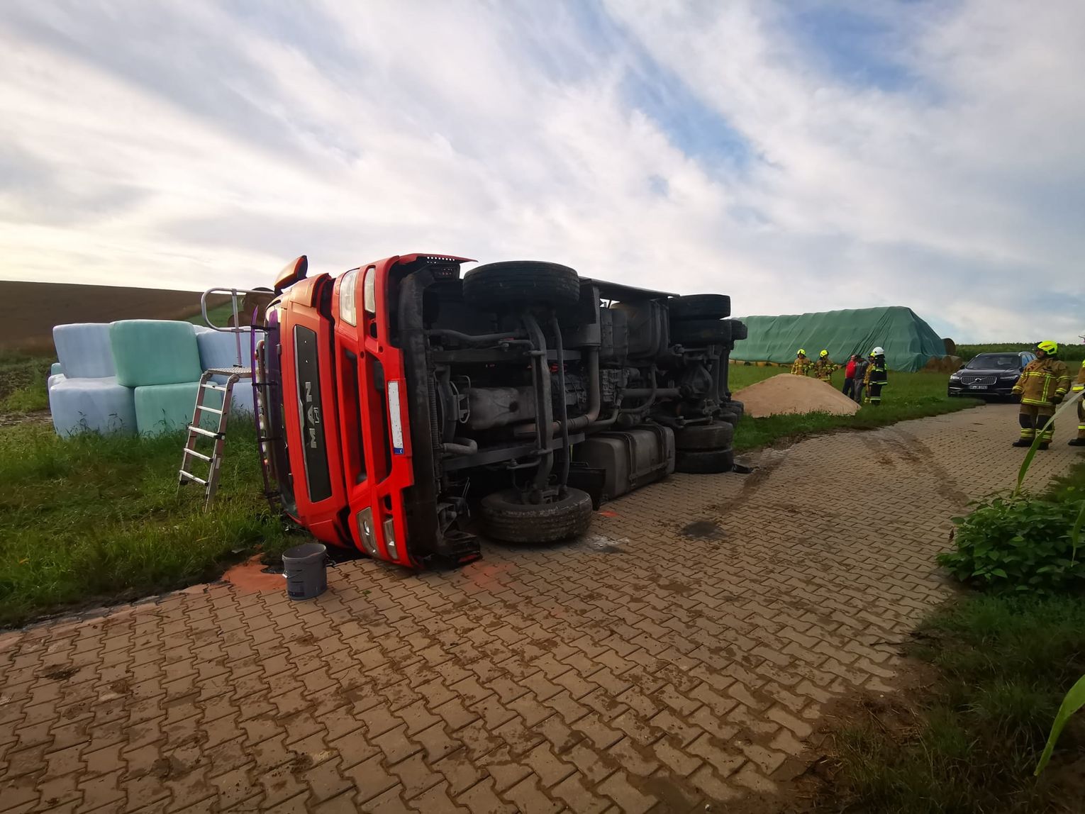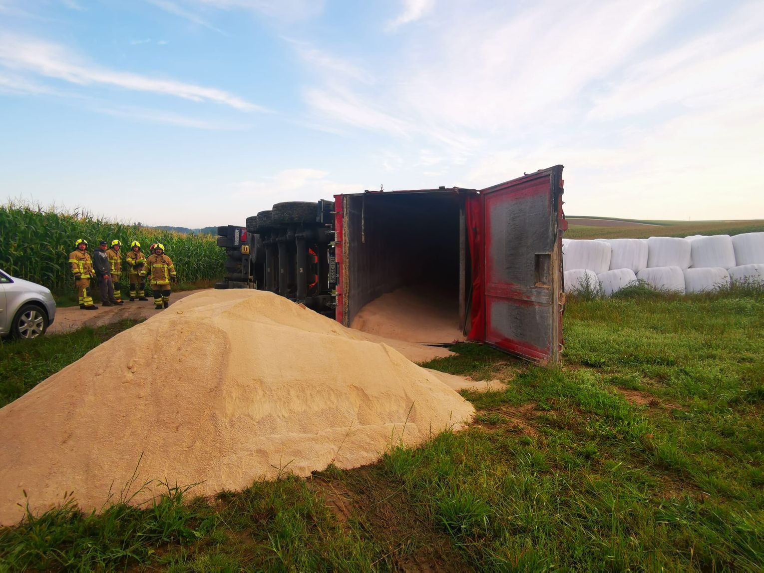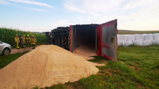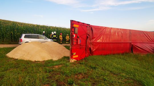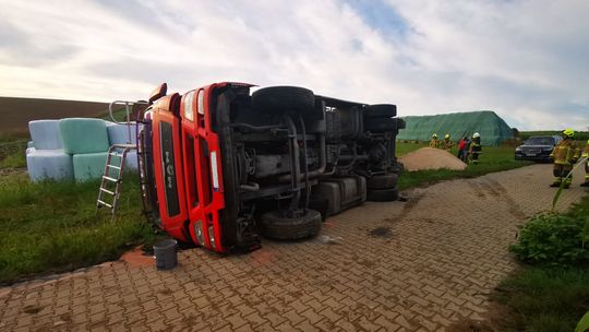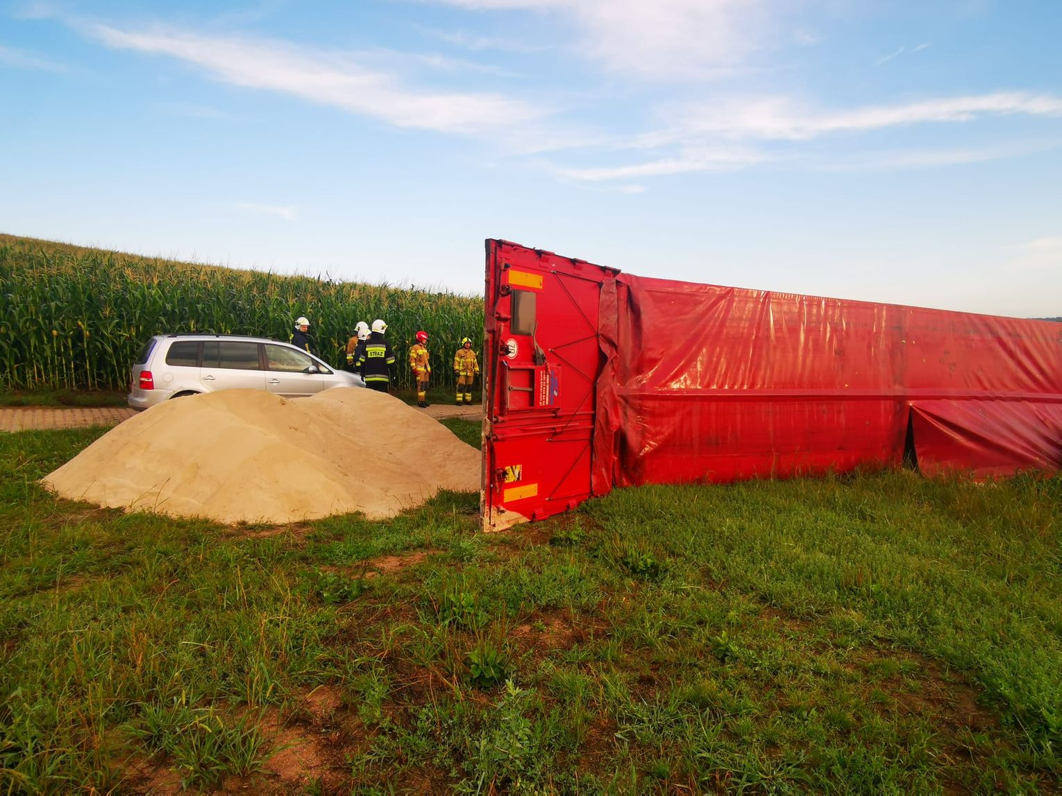 W czwartek 10 sierpnia po godzinie 6 rano służby interweniowały w związku z przewróceniem się samochodu ciężarowego podczas rozładunku materiału sypkiego w miejscowości Witosławice.