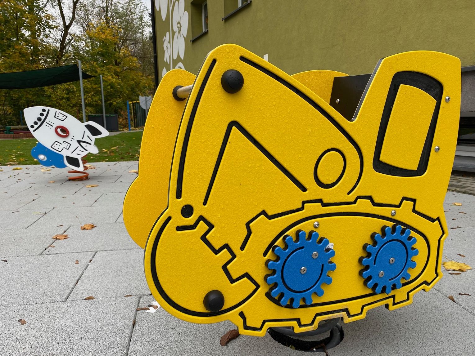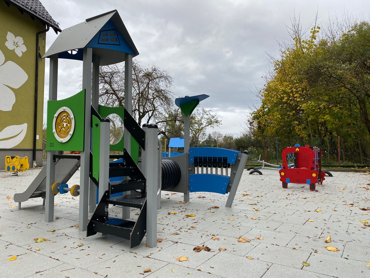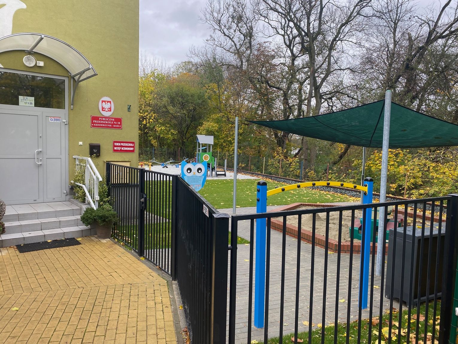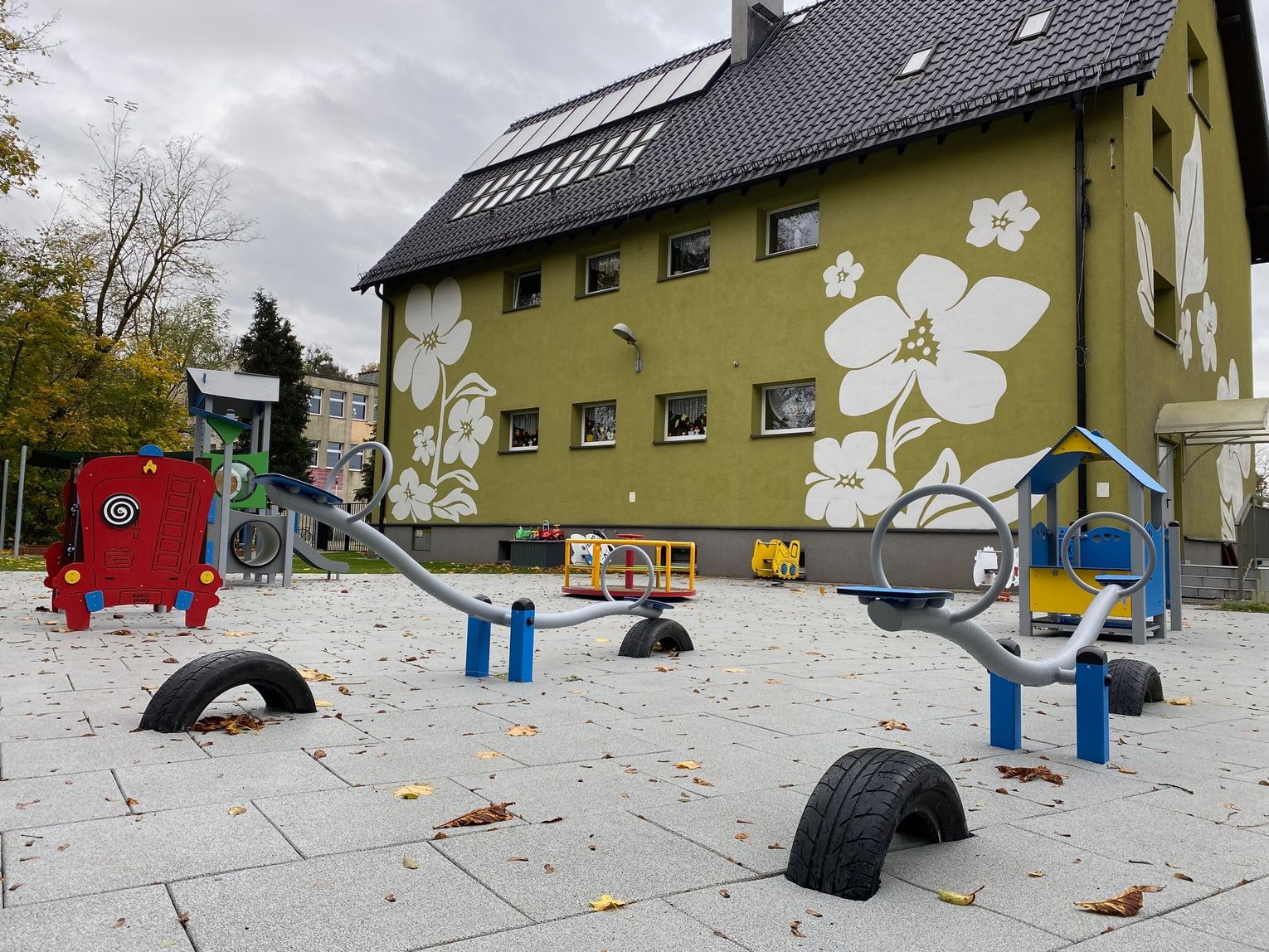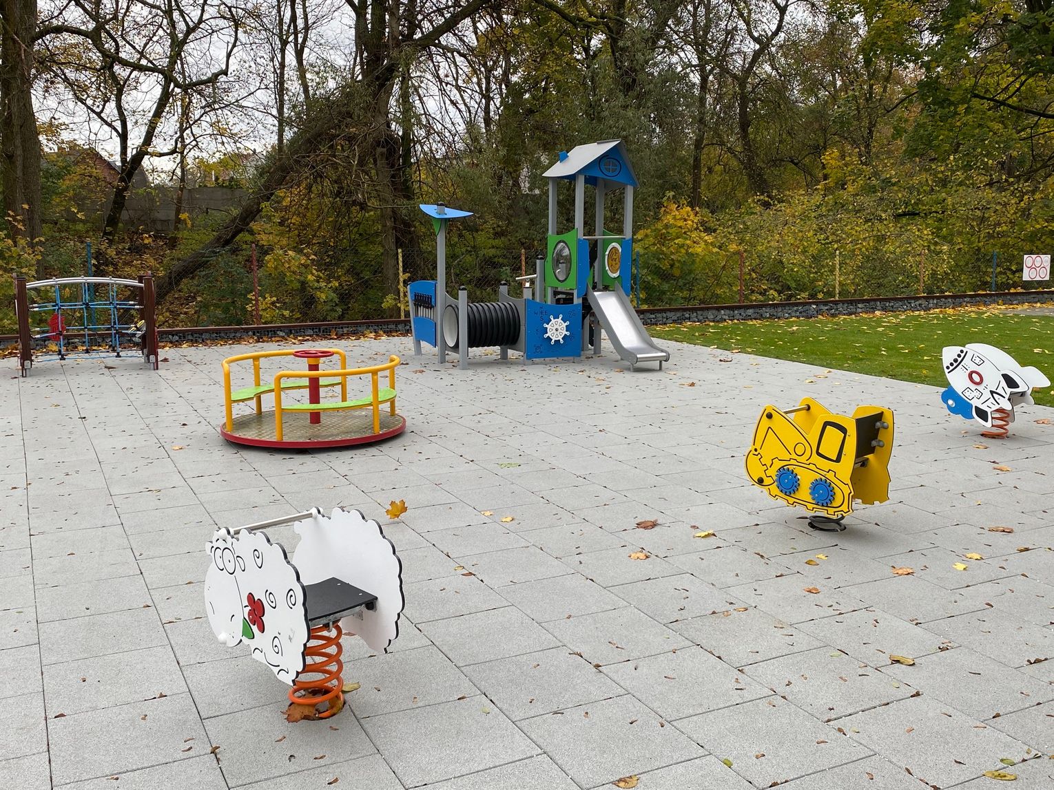 Szczególną uwagę zwraca na siebie nawierzchnia. Podłoże wykonane ze specjalnych poliuretanowych płytek zamortyzuje każdy upadek. Nowością pachną także zamontowane urządzenia. Wśród nich znalazły się bujaki, huśtawki, zamek, domek czy wóz strażacki. Nad istniejącą już piaskownicą góruje ogromny żagiel chroniący przed słońcem, a wzdłuż ogrodzenia pojawiły się ławki z koszy gabionowych. Całości dopełnia fragment trawnika rozłożonego z rolki.