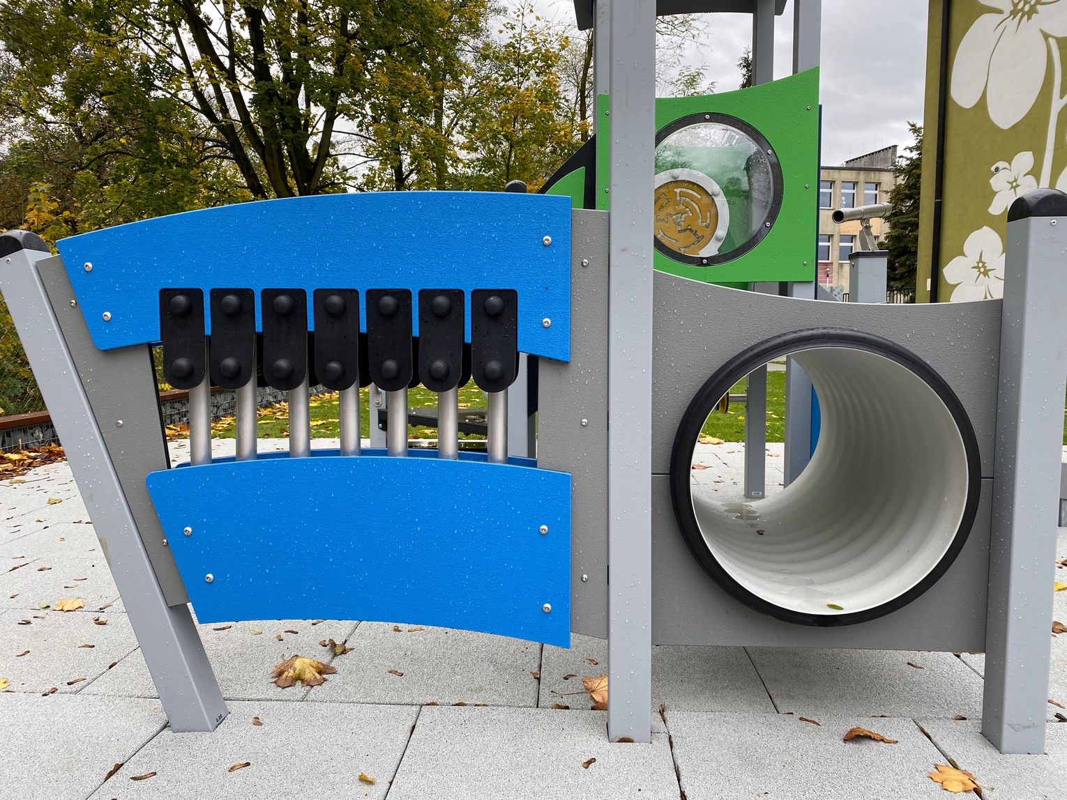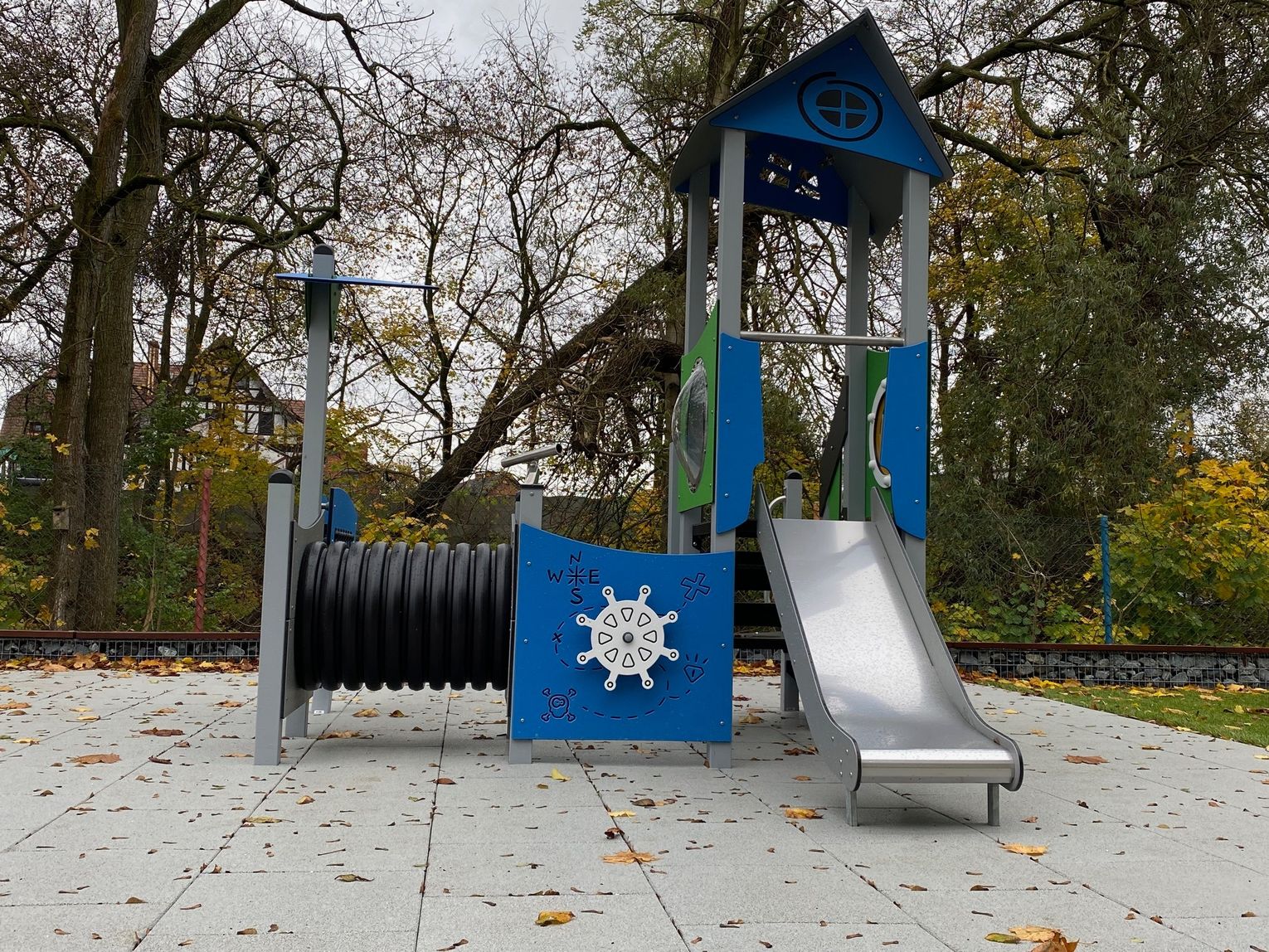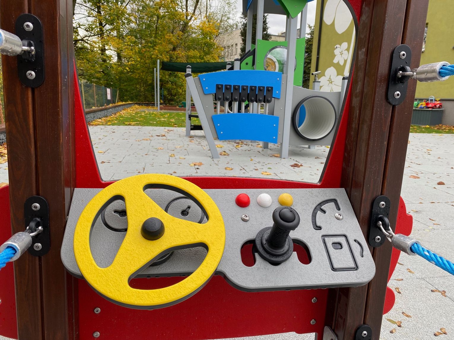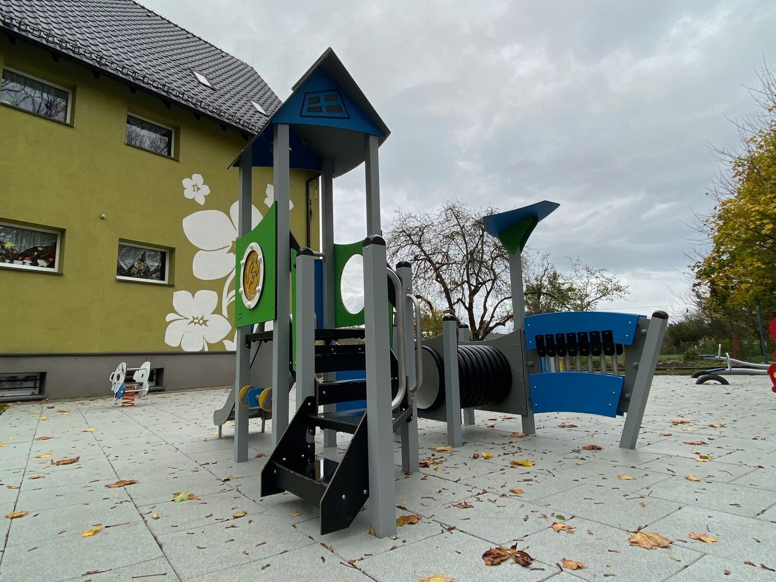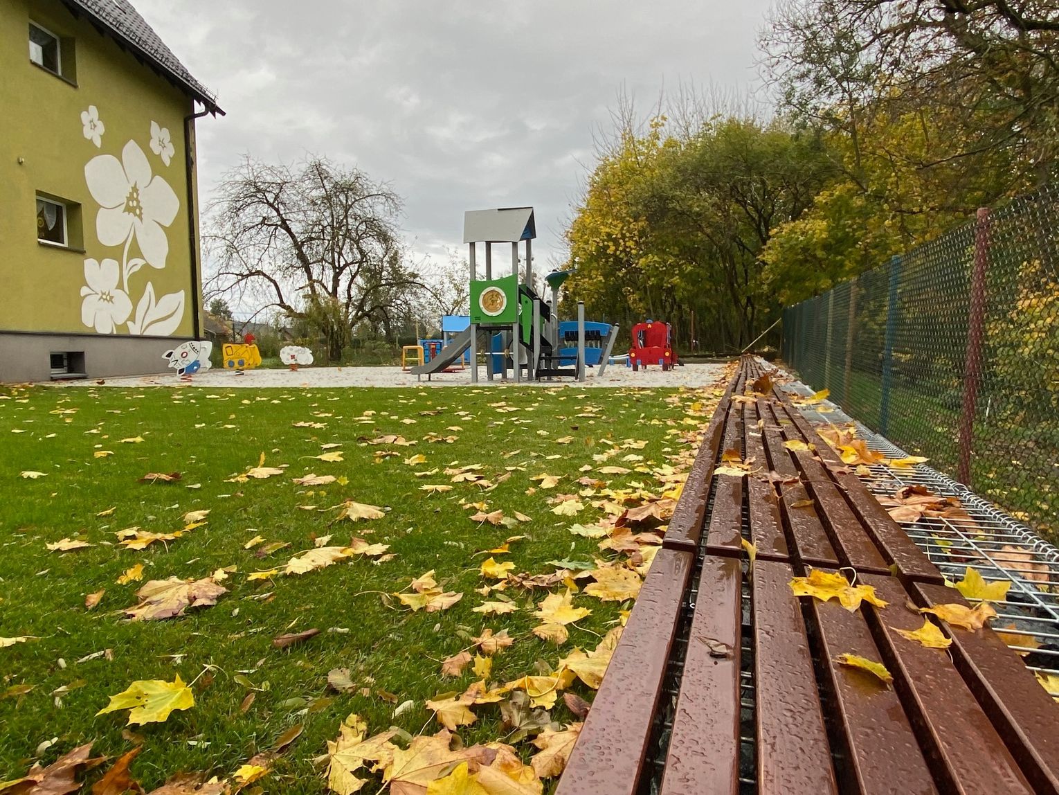 Szczególną uwagę zwraca na siebie nawierzchnia. Podłoże wykonane ze specjalnych poliuretanowych płytek zamortyzuje każdy upadek. Nowością pachną także zamontowane urządzenia. Wśród nich znalazły się bujaki, huśtawki, zamek, domek czy wóz strażacki. Nad istniejącą już piaskownicą góruje ogromny żagiel chroniący przed słońcem, a wzdłuż ogrodzenia pojawiły się ławki z koszy gabionowych. Całości dopełnia fragment trawnika rozłożonego z rolki.