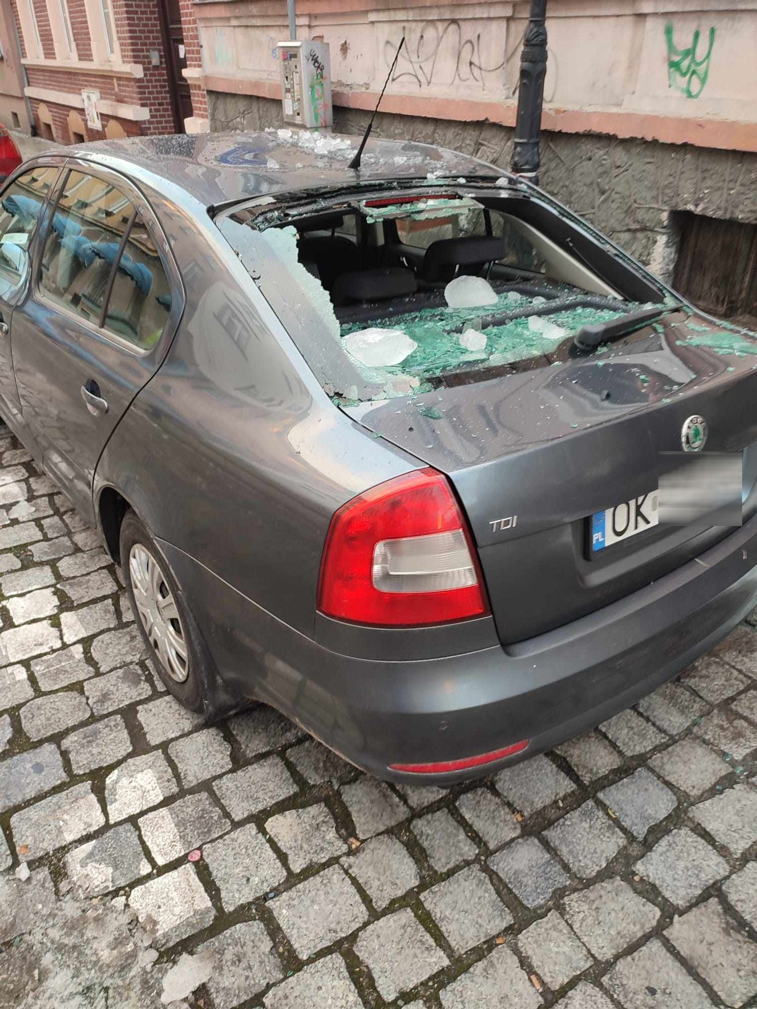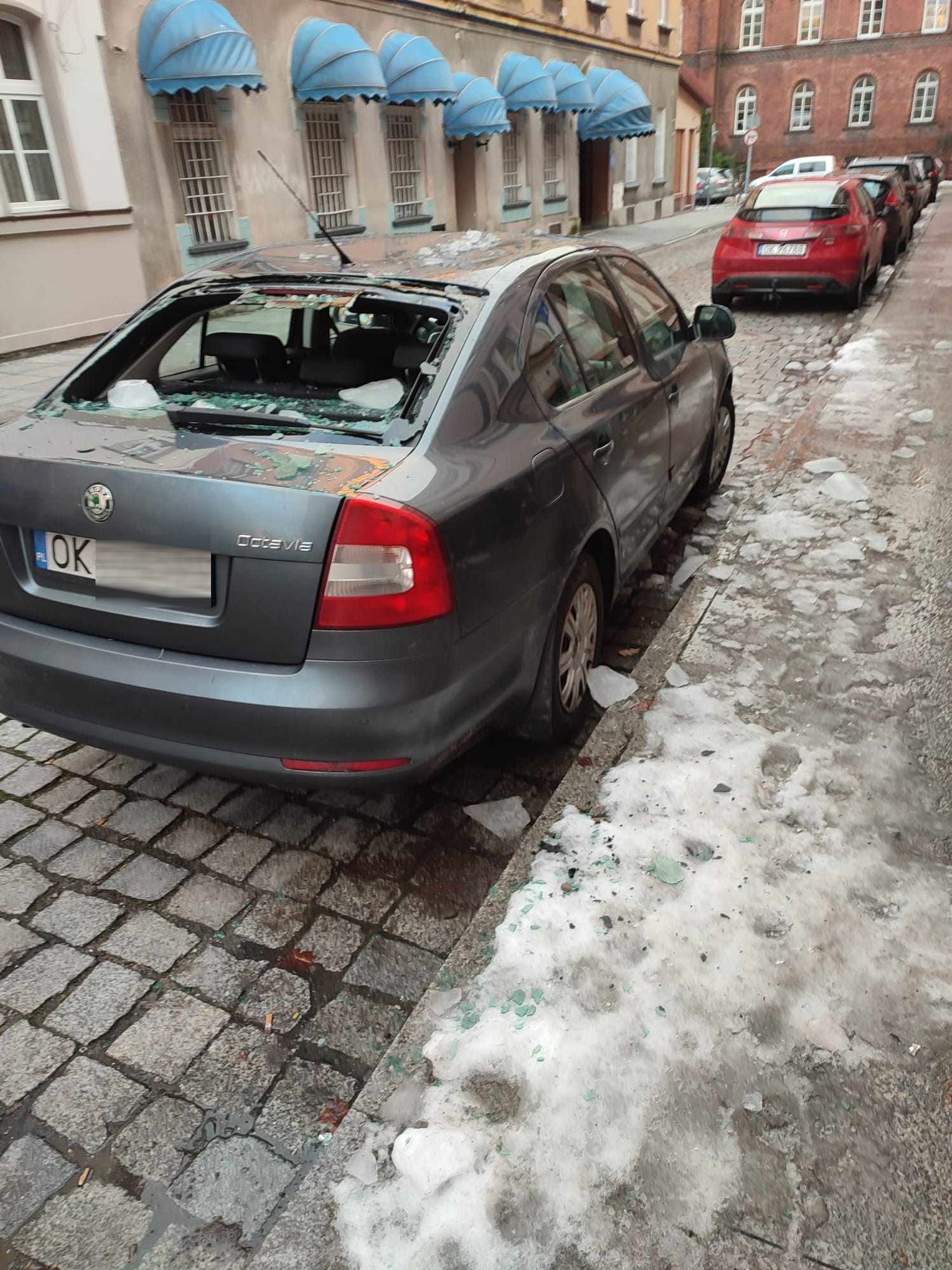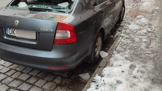 Z dachu budynku spadł lód uszkadzając zaparkowany samochód
