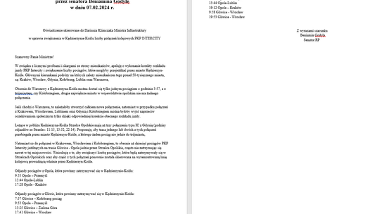 - Leżące w pobliżu Kędzierzyna-Koźla Strzelce Opolskie mają aż trzy połączenia typu IC z Gdynią. Godziny odjazdów ze Strzelec, to: 11:15, 13:52, 22:14. Proponuję, aby trasa jednego lub dwóch z tych połączeń przebiegała przez miasto Kędzierzyn-Koźle, z którego żaden pociąg nie jedzie do trójmiasta - podkreślił senator Beniamin Godyla i dodał - Natomiast co do połączeń z Krakowem, Wrocławiem i Kołobrzegiem, to obecnie aż dziesięć pociągów PKP Intercity jeżdżących na trasie Gliwice - Opole jedzie przez Strzelce Opolskie, często nie zatrzymując się nawet w tej miejscowości. Wnioskuję o to, aby zwiększyć liczbę pociągów, które będą zatrzymywały się w Strzelcach Opolskich oraz aby część z tych połączeń ponownie została skierowana na wyremontowaną linię kolejową prowadzącą właśnie przez Kędzierzyn-Koźle.