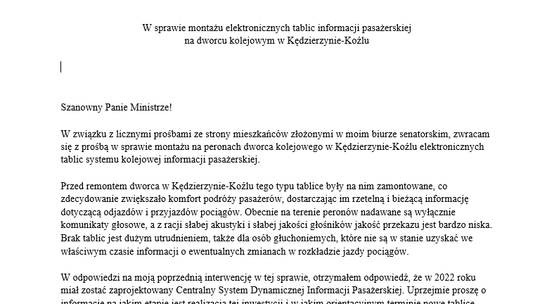 Senator ponownie zawnioskował także o to, aby na peronach dworca kolejowego w Kędzierzynie-Koźlu ponownie zostały zamontowane elektroniczne tablice informacji pasażerskiej.
