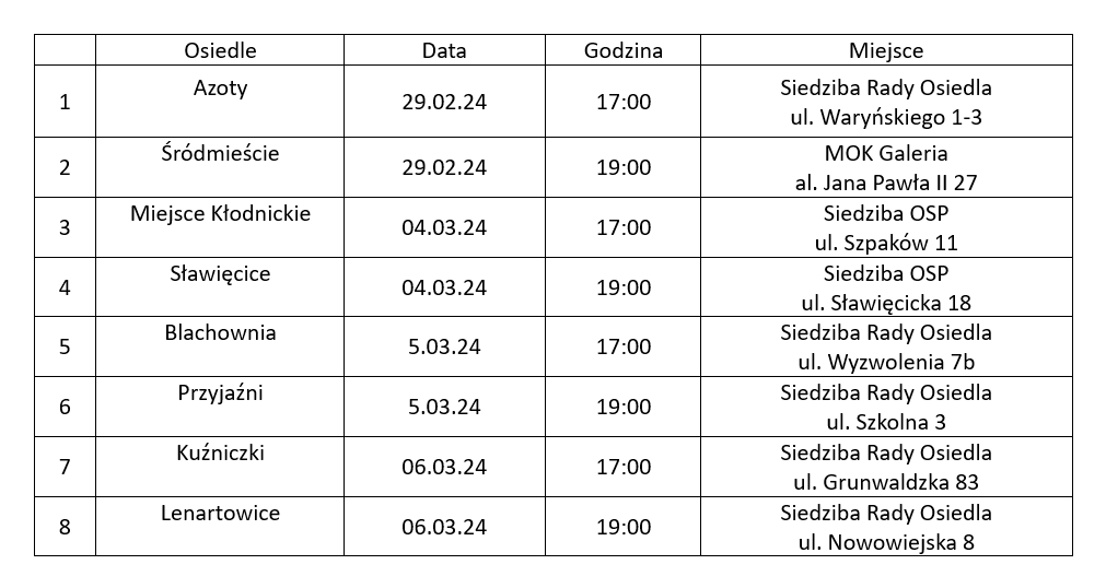 W pierwszej kolejności odbędą się spotkania na Azotach i w Śródmieściu (29.02), w Miejscu Kłodnickim i w Sławięcicach (04.03), w Blachowni i na osiedlu Przyjaźni (05.03) oraz na Kuźniczkach i w Lenartowicach (06.03). Terminy kolejnych spotkań zostaną opublikowane wkrótce.