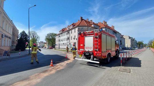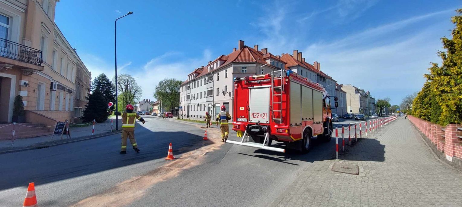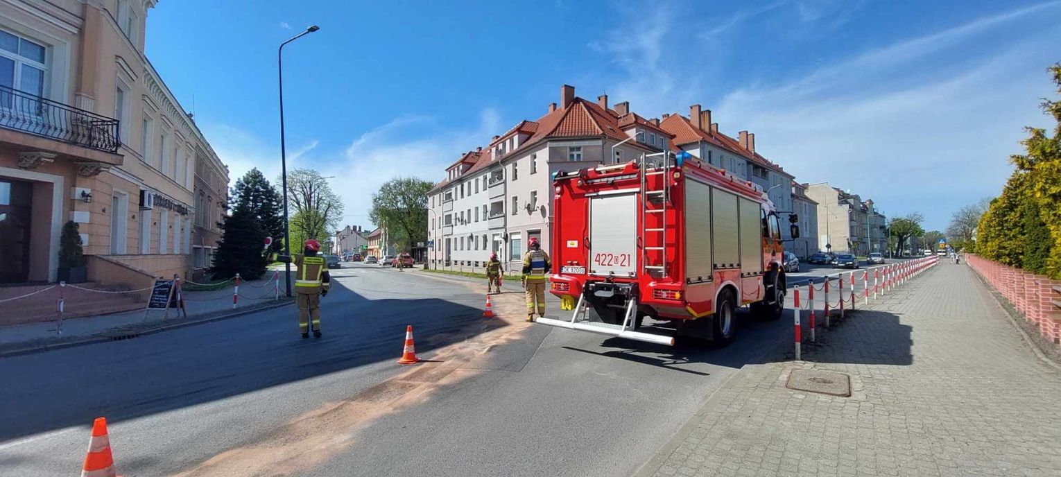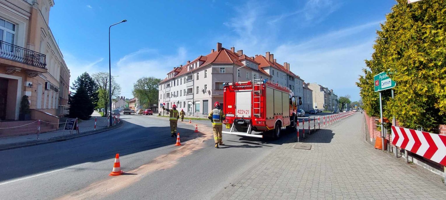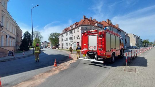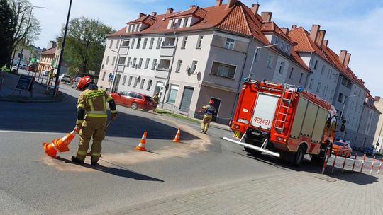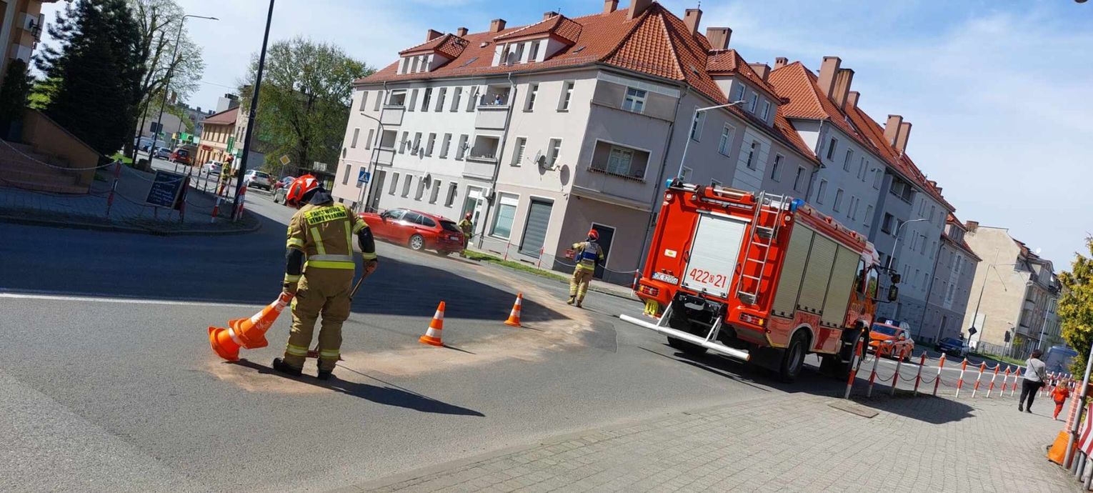 Z pojazdu wyciekł olej. Ruchem kierowali strażacy. ZDJĘCIA