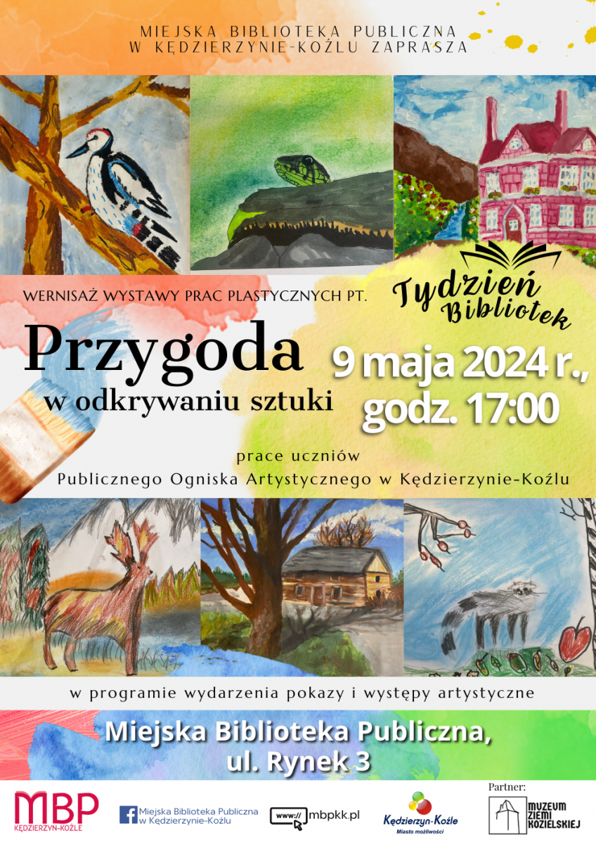 - 09.05, godz. 17:00, MBP – Wernisaż wystawy uczniów Publicznego Ogniska Artystycznego w Kędzierzynie-Koźlu pt. “Przygoda w odkrywaniu sztuki”