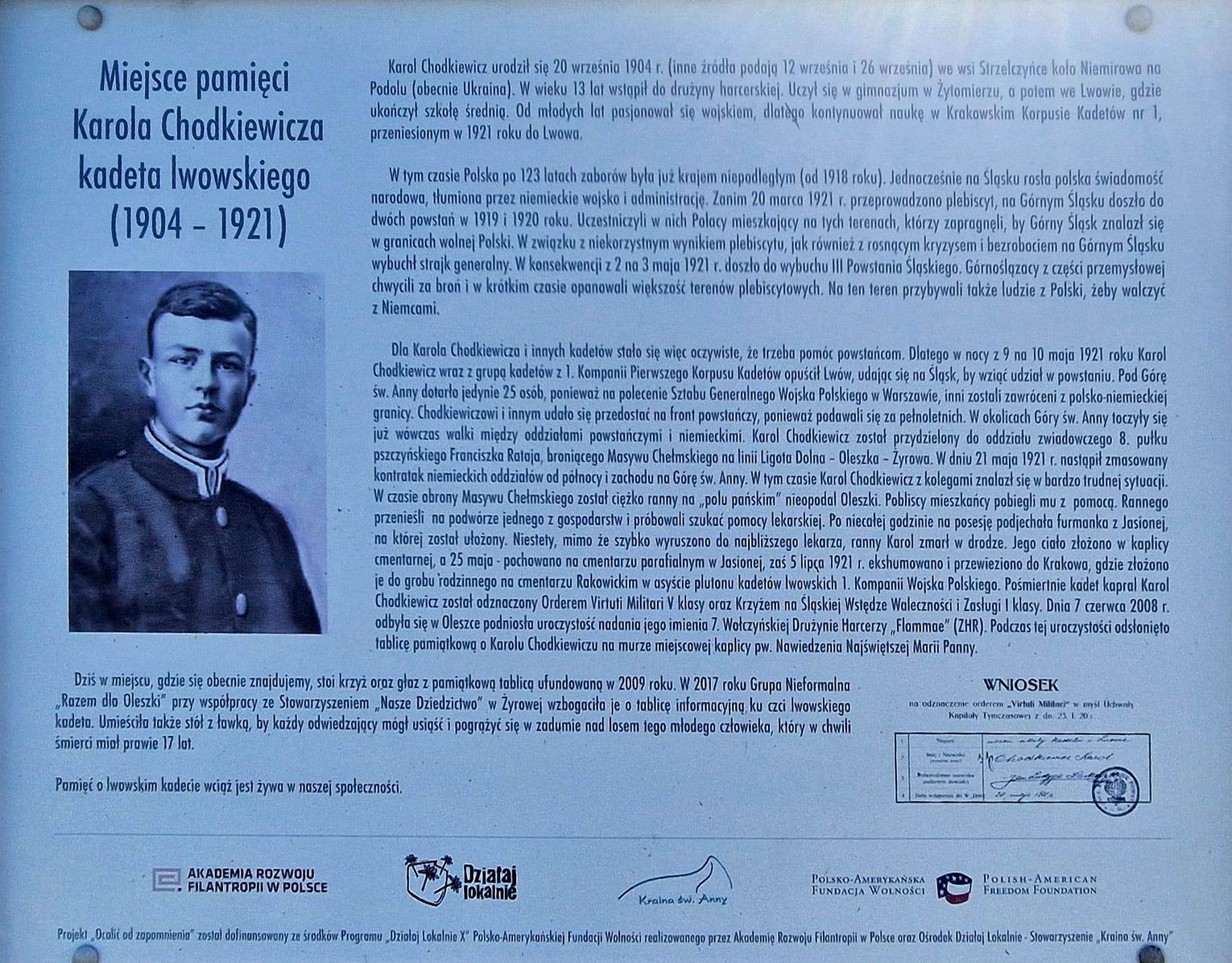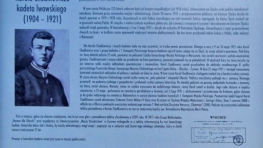Dzień Kadeta przypada 21 maja. Jednym z elementów jego obchodów było właśnie zapalenie znicza przy tablicy ku czci kadeta Karola Chodkiewicza, która znajduje się na ścianie kaplicy p.w. Nawiedzenia Najświętszej Marii Panny we wsi Oleszka oraz złożenie kwiatów przed tablicą w Muzeum Czynu Powstańczego na Górze św. Anny.