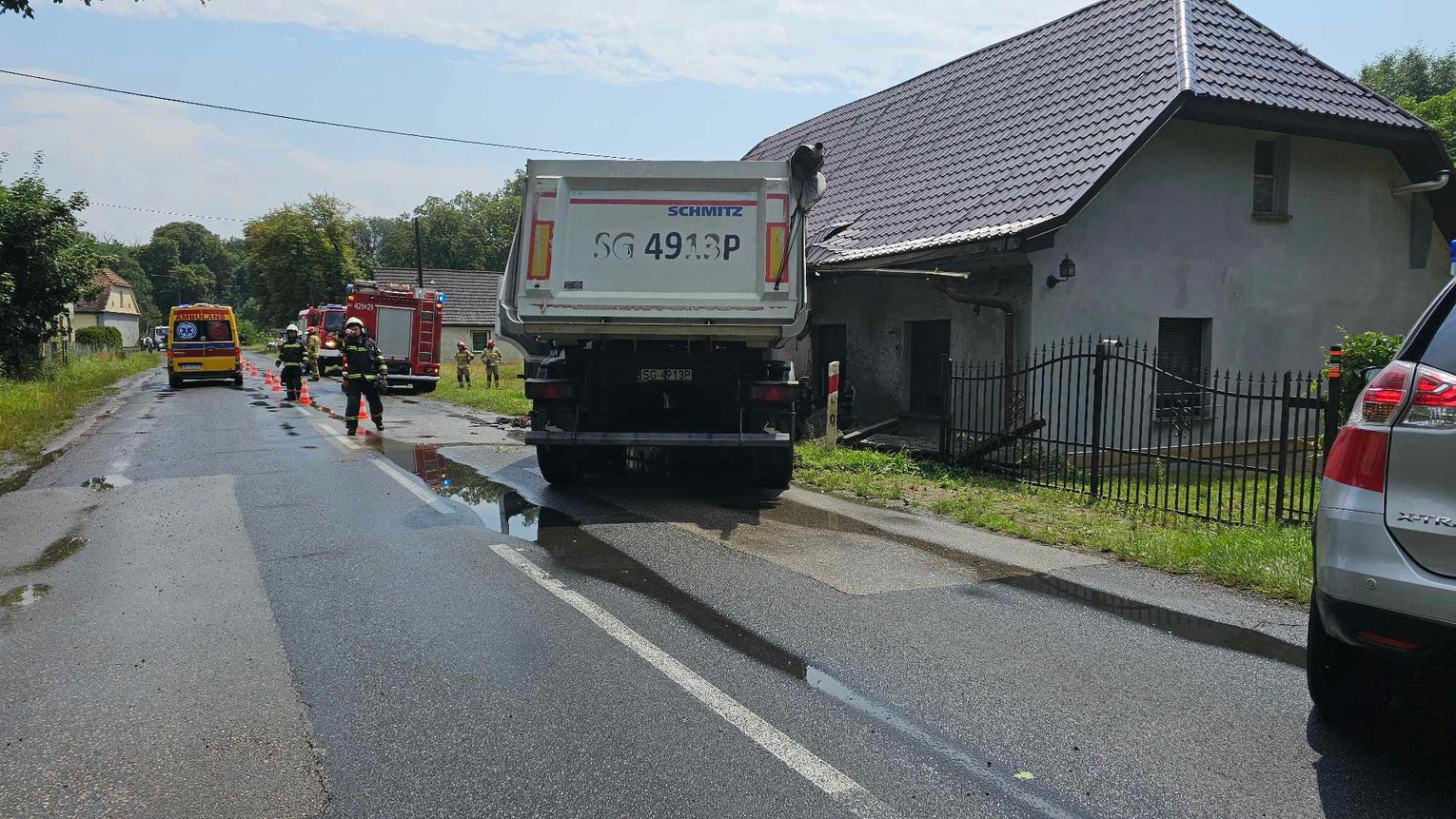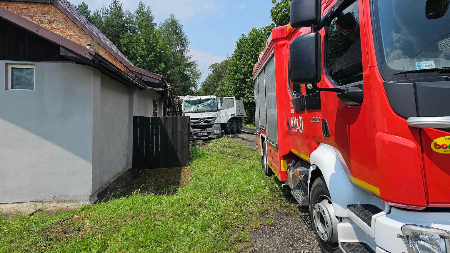 Jak udało się ustalić, starszy kierowca ciężarowego mercedesa jadąc od strony Gliwic w kierunku Kędzierzyna-Koźla na łuku drogi wpadł w poślizg i uderzył w dom. Ściana budynku częściowo się zawaliła. W chwili zdarzenia w budynku przebywało sześć osób. Żadnemu z mieszkańców nic się nie stało. Kierowca ciężarówki został przetransportowany do szpitala. Na czas prowadzonych działań droga początkowo była całkowicie zablokowana, a następnie wprowadzono ruch wahadłowy. Na miejscu interweniowały zastępy straży pożarnej, zespół ratownictwa medycznego oraz policja. Wezwano również nadzór budownictwa, aby ocenił, czy budynek nadaje się do dalszego użytku. Policjanci pracujący na miejscu ustalają szczegółowe okoliczności tego zdarzenia.
