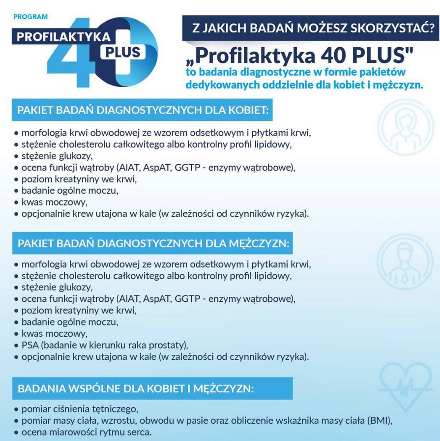 Szczegóły, jak skorzystać z pakietów dostępne są w „Poradniku Pacjenta” opublikowanym na stronie: https://pacjent.gov.pl/program-profilaktyczny/program-profilaktyka-40-plus.