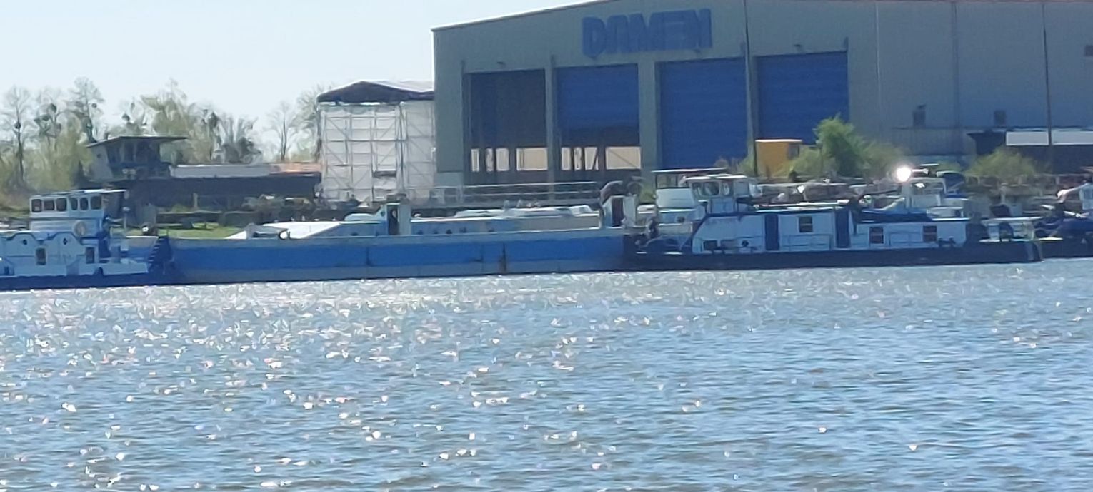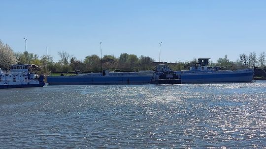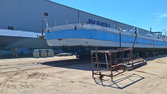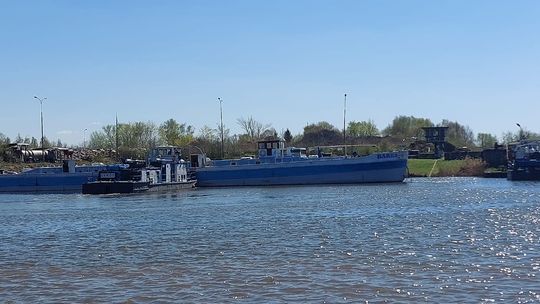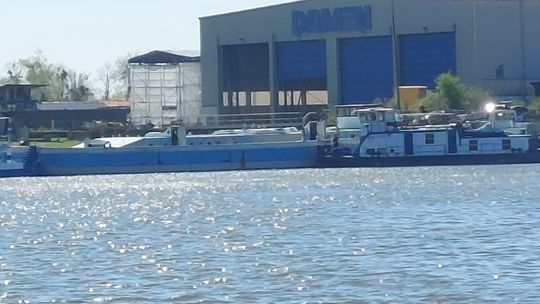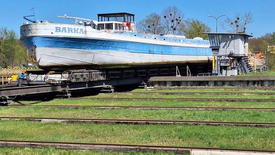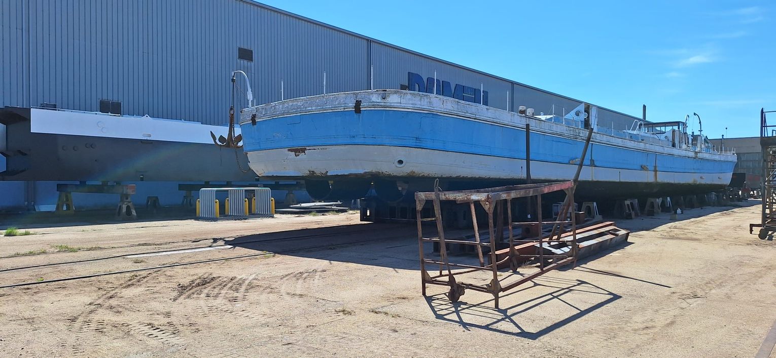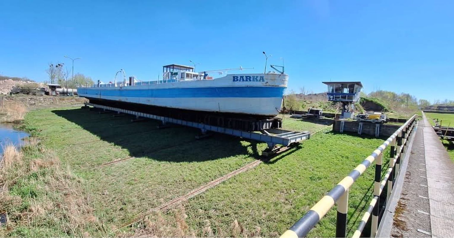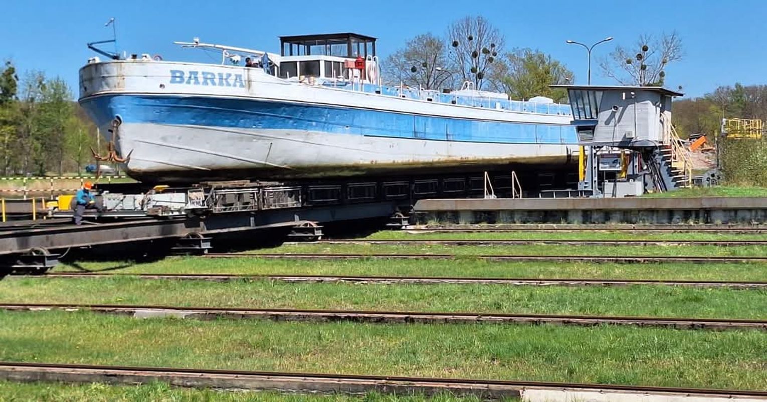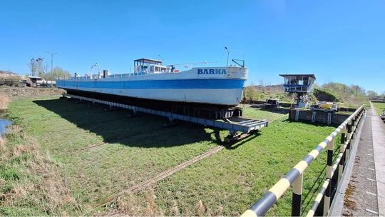 Z wody (ze wsparciem pchacza) licząca 55 metrów barka trafiła najpierw na pochylnię, a następnie na stoczniowy plac. Obecnie czeka bezpiecznie na remont.
