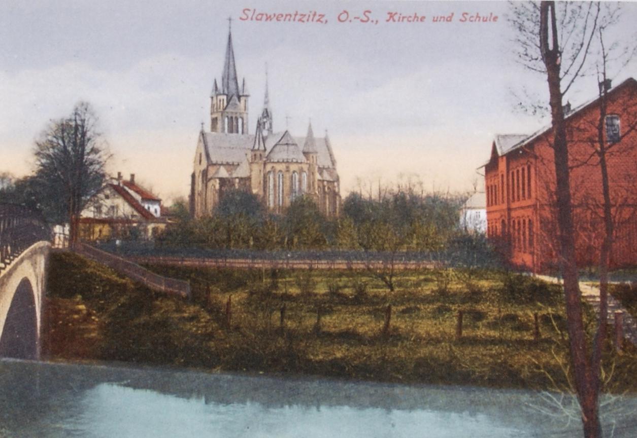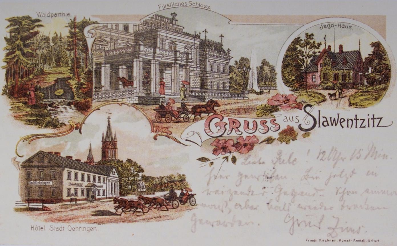 Sławięcice na kartach pocztowych pojawiły się w latach 90. XIX wieku. Najstarsze pochodzą z 1896 roku. Są to litografie z gliwickiego wydawnictwa Schönwolf oraz z warsztatu Maksa Steckela z Królewskiej Huty. W tej technice graficznej rysunek przeznaczony do powielania wykonywało się na tzw. kamieniu litograficznym, za pomocą którego robiło się następnie odbitki. Pierwsza zachowana widokówka ze Sławięcic została wysłana 5 czerwca 1896 roku z Zabrza w okolice Berlina. Barwna litografia przedstawia pałac i kościół z fragmentem budynku probostwa, które, co ciekawe, zostało umieszczone w niewłaściwym miejscu. Tło uzupełniają sarny pasące się nad rzeką. O popularności Sławięcic jako książęcej siedzibie, a także miejscu wypoczynkowo-sanatoryjnym świadczyć może duża liczba widokówek, które wydano na przełomie XIX i XX wieku.
