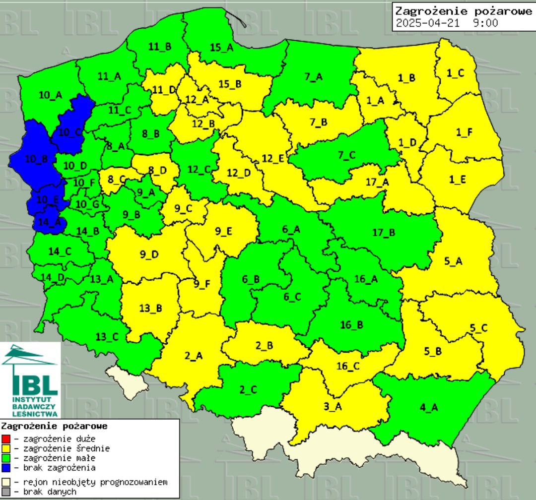 Tak prezentuje się aktualna mapa zagrożenia pożarowego w lasach w całym kraju.