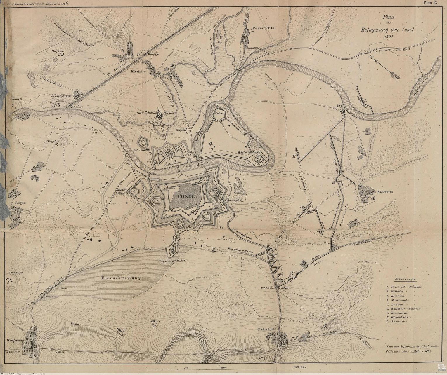 W 1807 roku Koźle w ciągu niespełna pięciu miesięcy oblegało 7546 żołnierzy bawarskich i francuskich. Twierdzy broniło 67 oficerów i 4249 szeregowych, dysponujących 229 działami. Jej pruska załoga poniosła ogromne straty. Z 4316 osób przeżyło ok. 1100-1500. Straty oddziałów francusko-bawarskich były minimalne.