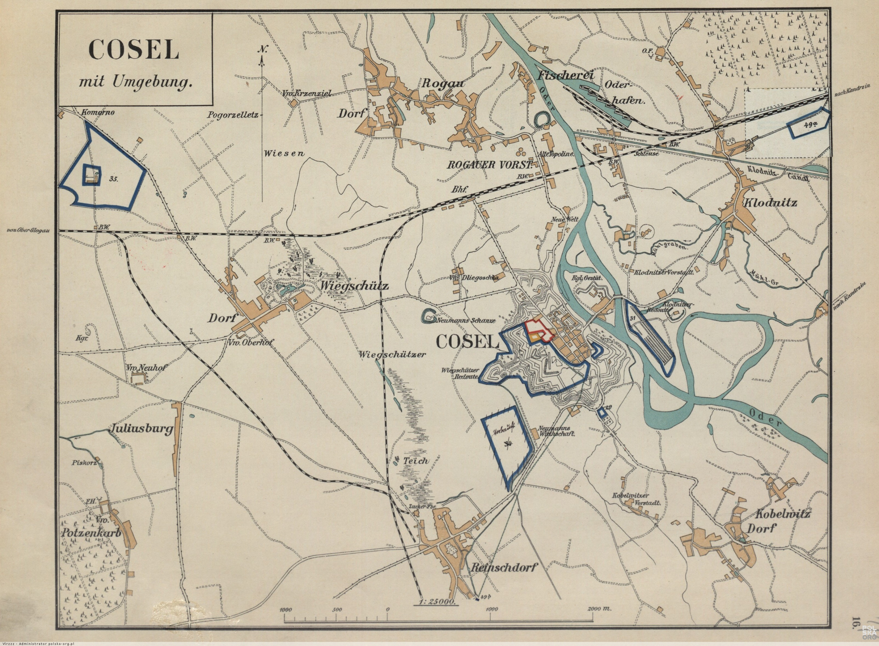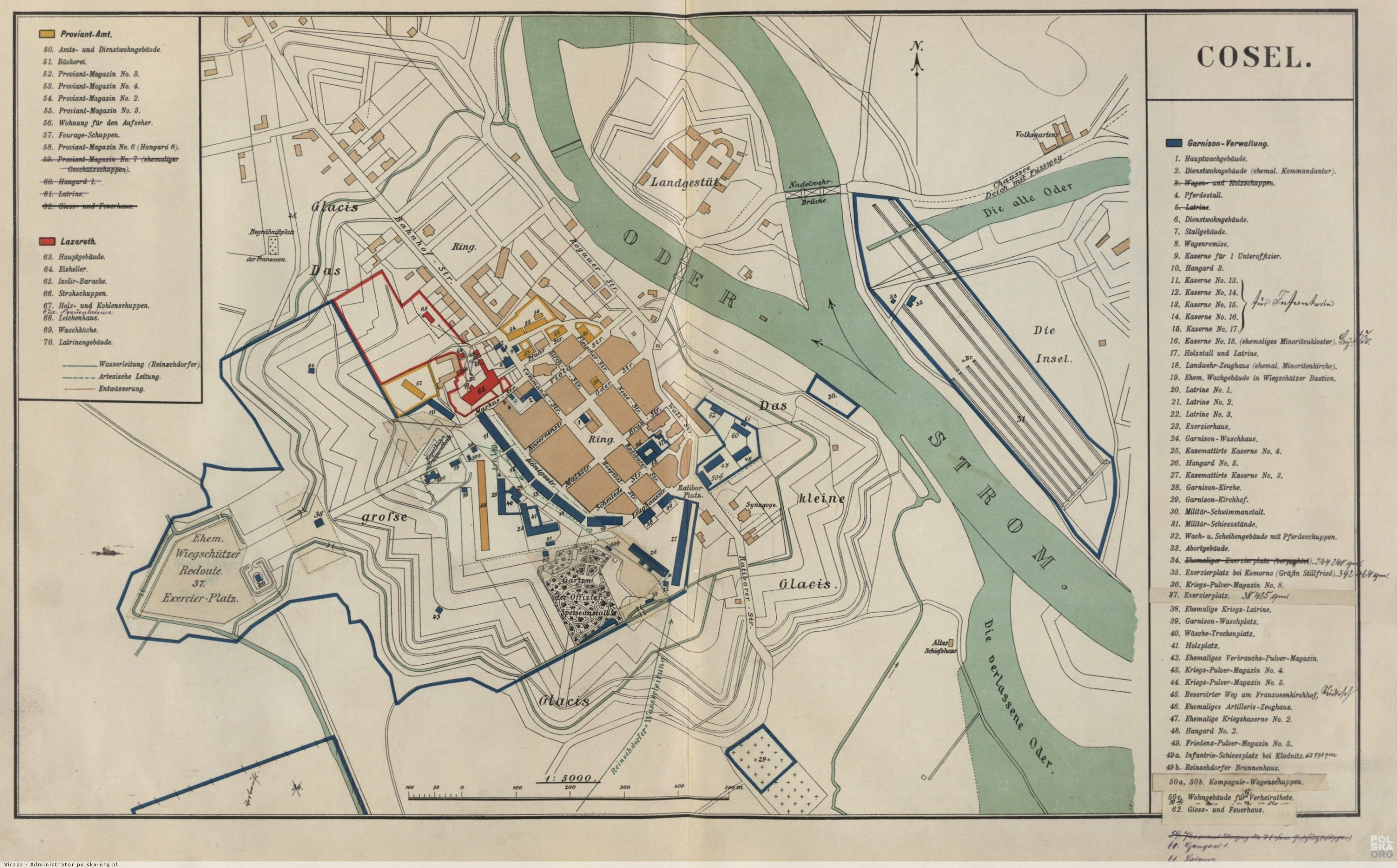 Ostatnio na facebookowym profilu „Jestem z Koźla” zauważono, że w marcu 2025 roku w portalu Polska org. pojawiły się interesujące plany Koźla. To pochodzące z Archiwum Państwowego we Wrocławiu skany atlasu garnizonów wrocławskiego korpusu armijnego. Oczywiście nie mogło zabraknąć twierdzy Koźle wraz z jej licznymi obiektami, podzielonymi na trzy części: administracyjną (kolor niebieski), zaopatrzeniową (żółty) i szpitalną (czerwony).