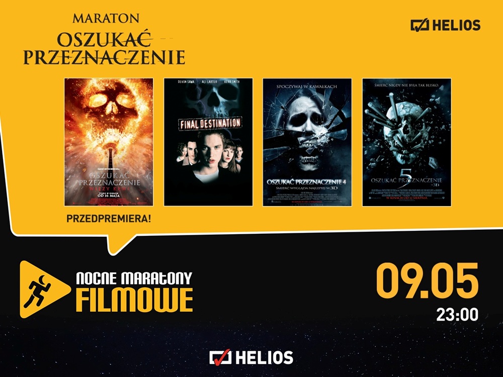 W piątek 9 maja, kina Helios zapraszają na mrożącą krew w żyłach noc nieuchronnego przeznaczenia z kultową serią filmów grozy. Rozpoczniemy przedpremierowym pokazem filmu „OSZUKAĆ PRZEZNACZENIE: WIĘZY KRWI”, w którym przeniesiemy się do początków, kiedy śmierć zaczęła realizować swoje obłąkane poczucie sprawiedliwości. Prześladowana strasznym, powtarzającym się koszmarem studentka Stefanie wraca do rodzinnego miasta. Chce odnaleźć jedyną osobę, która może przerwać błędne koło i ocalić członków jej rodziny przed niechybnie czekającą ich makabryczną śmiercią. Dalej pierwszy z serii, film „OSZUKAĆ PRZEZNACZENIE” z 2000 roku. Po krótkiej przerwie pokażemy jeszcze dwie części, kolejno „OSZUKAĆ PRZEZNACZENIE 4”, a jeśli wystarczy Wam jeszcze odwagi, na koniec „OSZUKAĆ PRZEZNACZENIE 5”. Mieliście kiedyś natrętne przeczucie, które się sprawdziło?