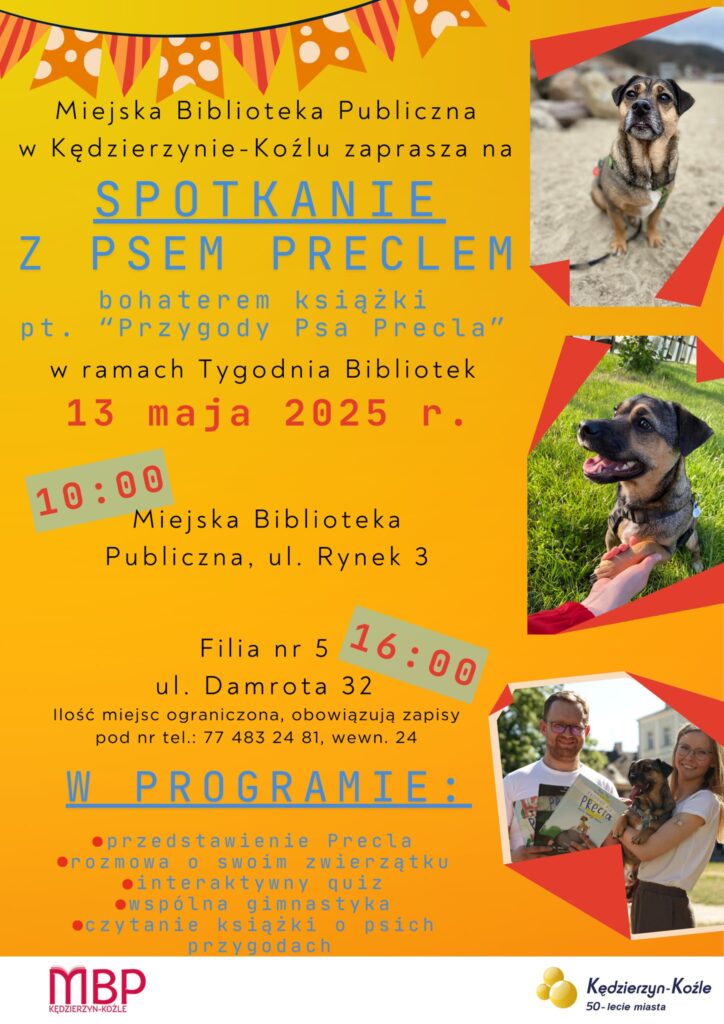 13 maja 2025 r., godz. 10:00, MBP – Spotkanie dla dzieci z psem Preclem, bohaterem książek