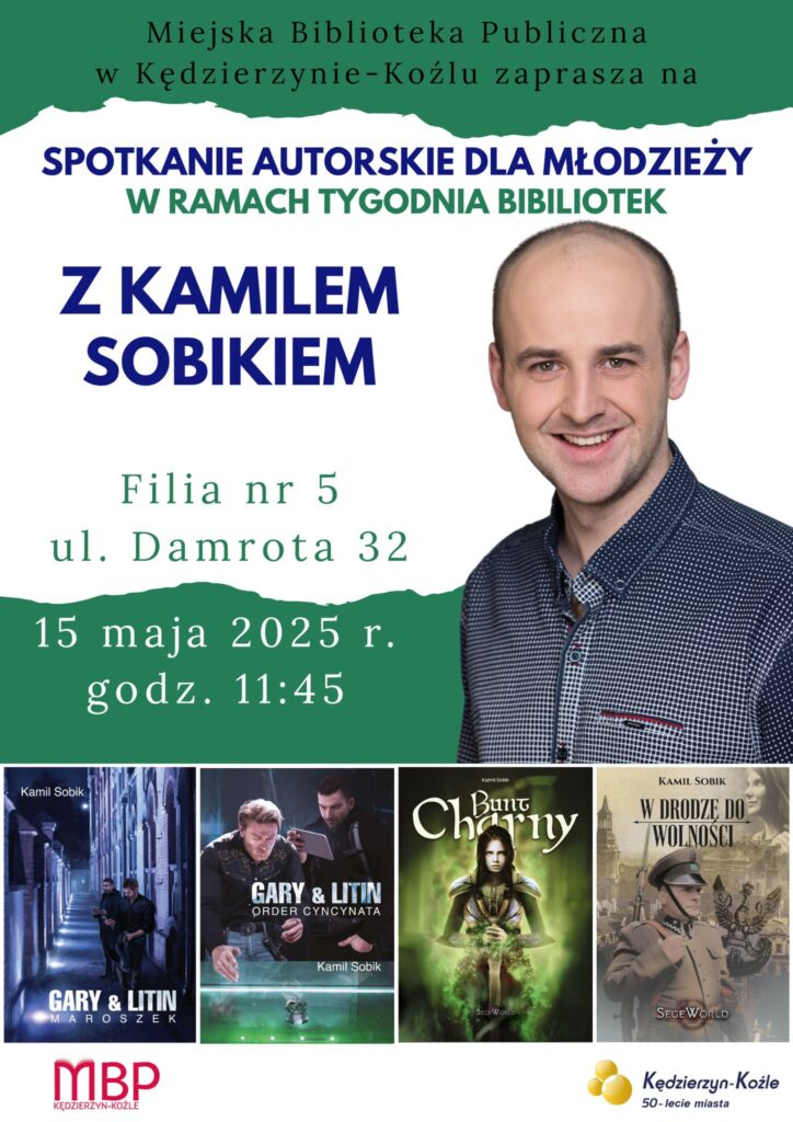 15 maja 2025 r., godz. 11:45, Filia nr 5 – Spotkanie autorskie dla młodzieży z Kamilem Sobikiem