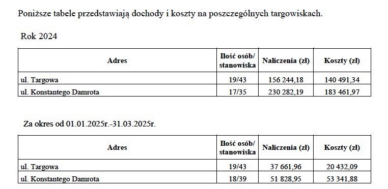 Natomiast targowisko przy ul. Damrota oddane zostało do użytku w lipcu 2017 roku, po jego modernizacji. Na dzień 31 grudnia 2024 r. działalność prowadziło tam 17 osób, zajmujących 35 stanowisk. Pustych stanowisk było 39. Na dzień 31 marca br. działalność prowadzi 18 osób zajmujących 39 stanowisk. Pustych stanowisk jest 35. Towary pochodzące z własnych upraw sprzedaje 8 osób.